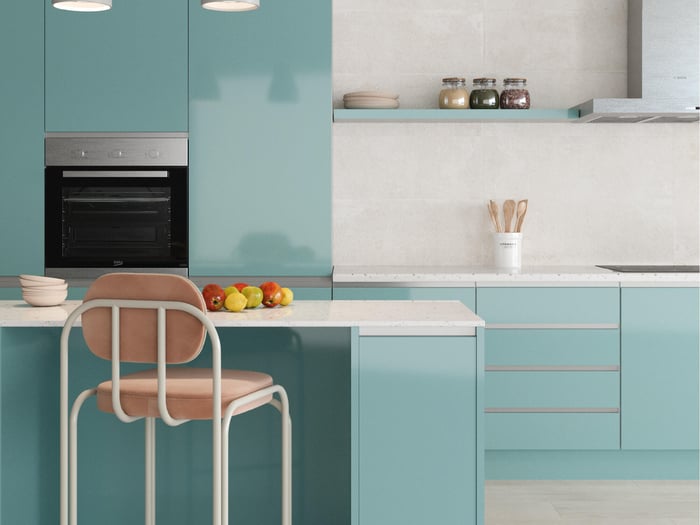 La cocina modelo Alicante destaca por su estilo moderno. Líneas rectas en color verde agua con detalles de tiradores en plata hacen de esta cocina, en material alto brillo, la opción ideal para aquellos que buscan una cocina fuera de lo convencional.
