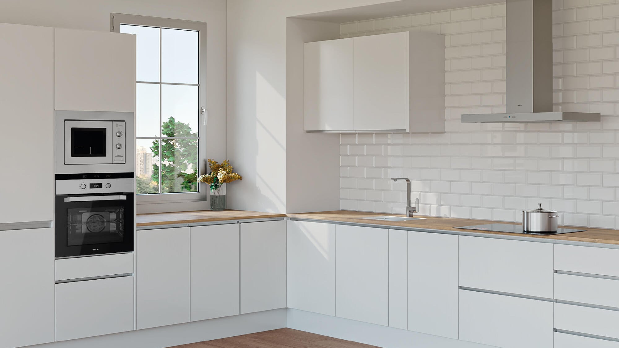 La cocina Toledo combina estilo moderno y funcionalidad gracias a su acabado en alto brillo blanco fabricado en material PET. Este material ecológico y resistente ofrece una superficie fácil de limpiar, con alta durabilidad y un aspecto impecable.