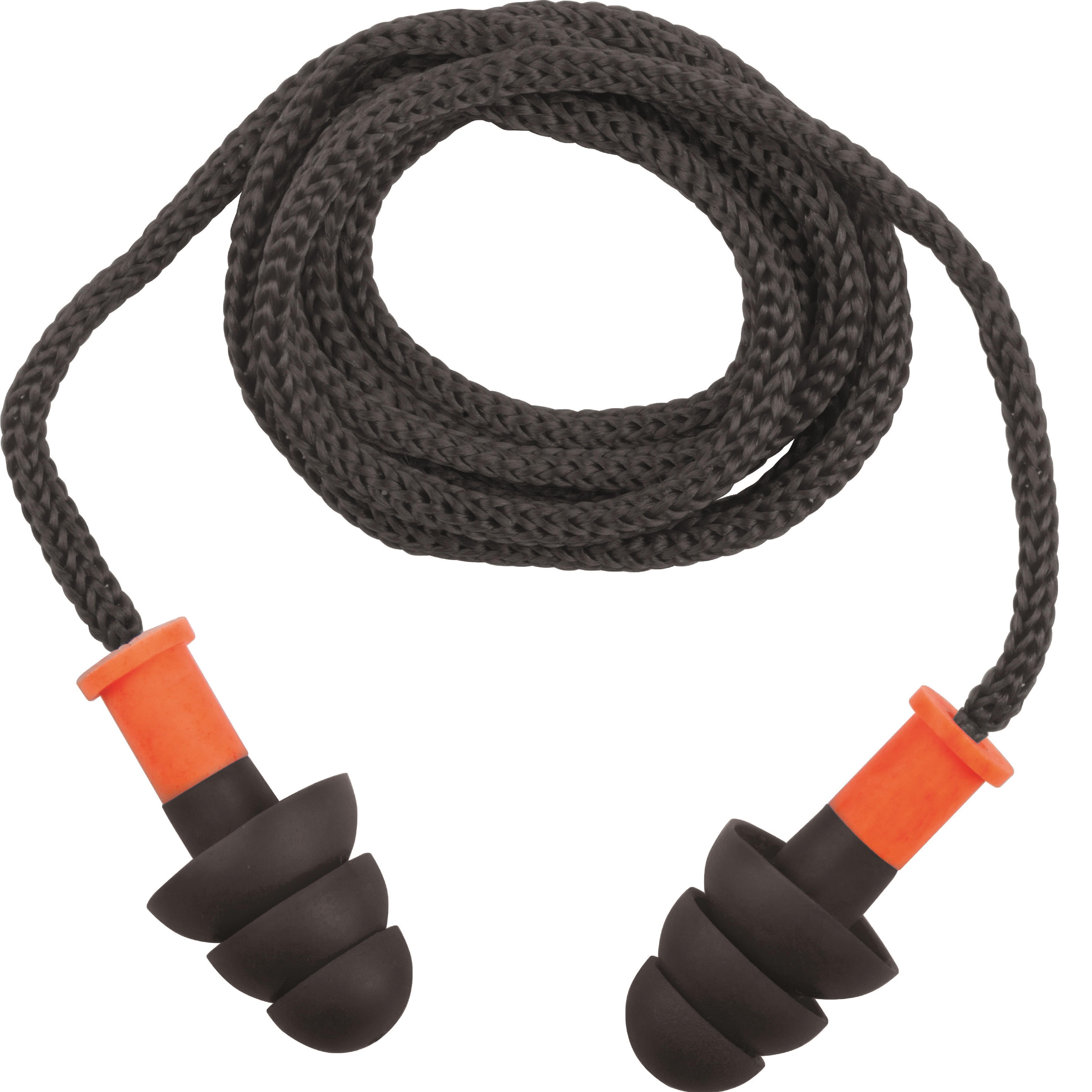 Tapones auditivos reutilizables en termoplástico con cordón textil. SNR34. Utilizables con o sin cordón. Cuerda de nylon trenzado. Color gris. Óptima impermeabilización y atenuación del ruido.
