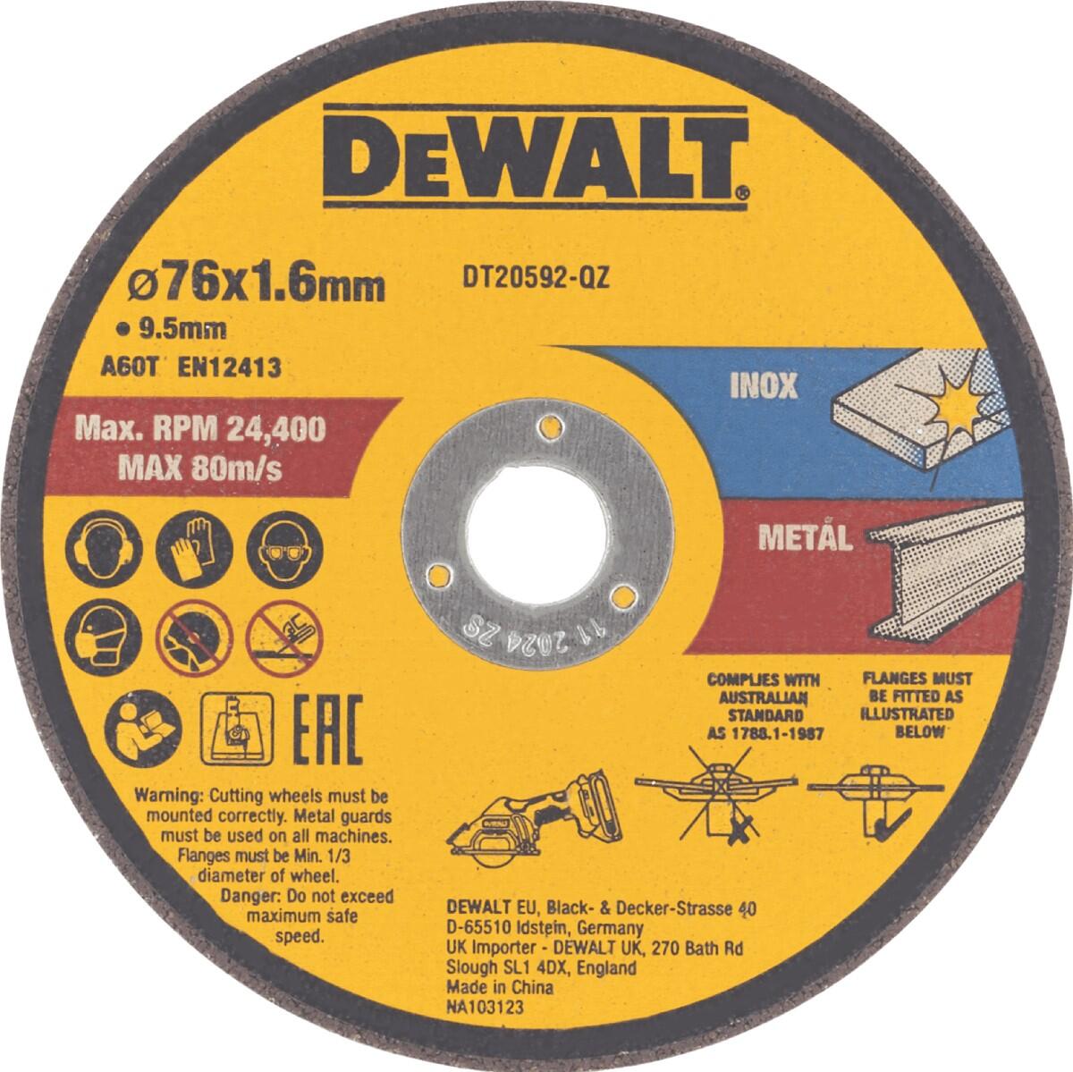 Disco de corte abrasivo DEWALT DT20592-QZ Ø76x1.6x9.5mm. 3 Unidades. Cortes rápidos gracias al grano de óxido de aluminio de alta resistencia. Fabricado con dos láminas de fibra de vidrio para otorgar una mayor resistencia y reducir las posibilidades de rotura.