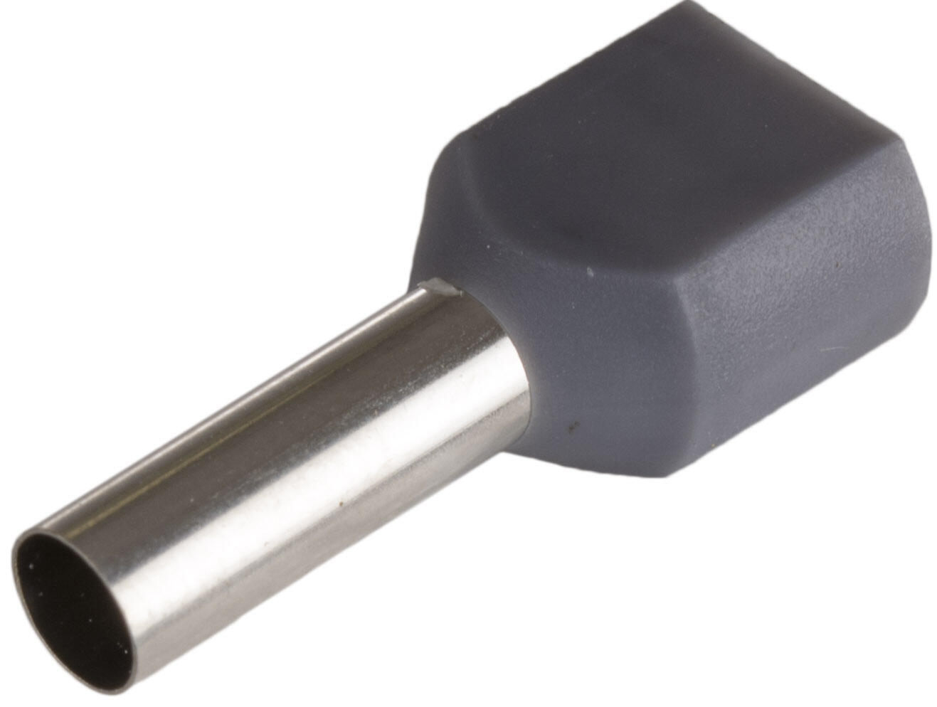 Terminal de puntera hueca doble en color gris de 12mm para cable de 2x4mm² en bolsa de 50 unidades. Este producto se enmarca dentro de una gama de productos consistente en bornes, terminales y aislamiento.