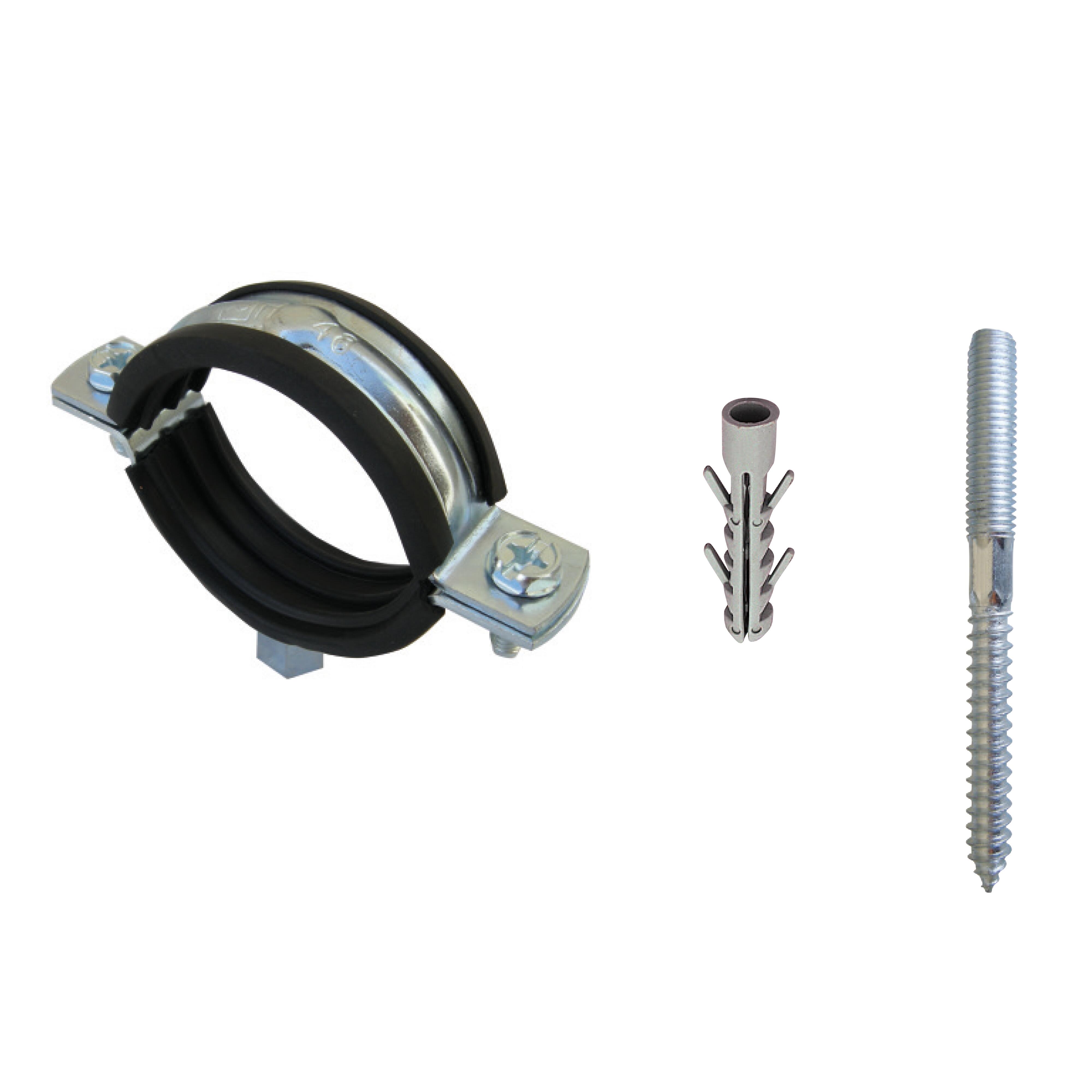 Abrazadera isofónica. •Para tuberías desde Ø22mm. •Acabado cincado electrolítico. •Goma de EPDM para aislamiento y reducción del sonido. •Incluye tornillos y tacos. 2 UNIDADES