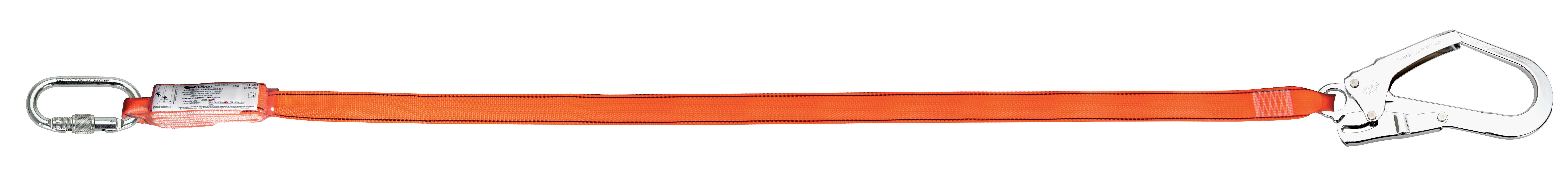 Absorbedor de energía formado por una banda de absorción y una banda de sujeción y amarre. La banda de absorción es una banda de color blanco formada por dos piezas textiles entretejidas, plegada y situada dentro de una funda de plástico transparente. La banda de sujeción y amarre está es una cinta de poliéster color naranja con terminaciones en forma de gazas protegidas mediante una funda de plástico transparente. Anchura de la cinta (en mm): 45 Uso del producto: Contra caídas de altura