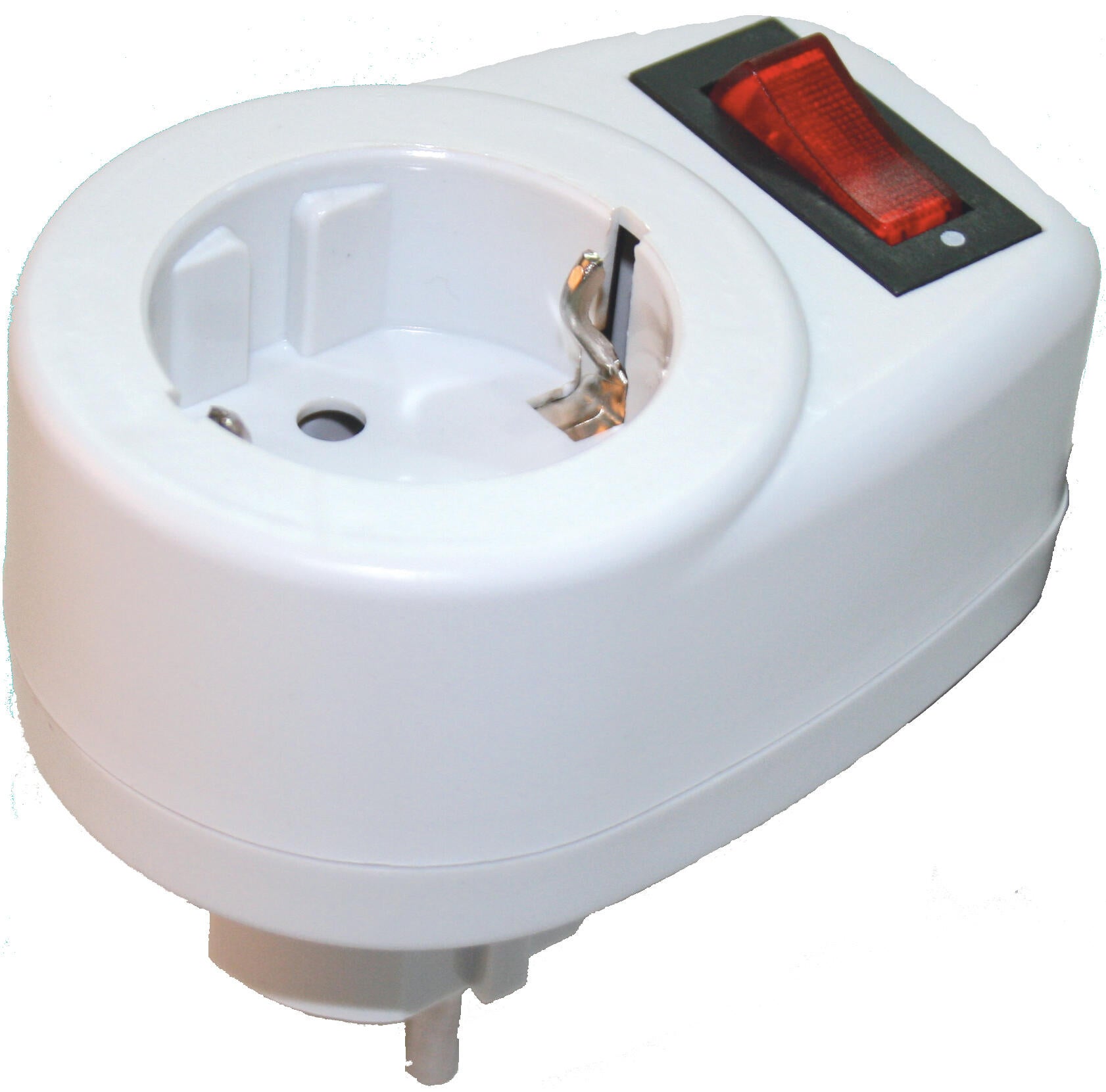 Clavija/adaptador bipolar blanco con toma de tierra lateral, interruptor luminoso, espigas de 4,8mm de diámetro, material termoplástico, potencia máxima admisible 3680w, 2P+T. 16A 250w
