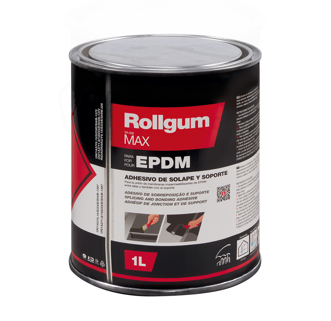 Adhesivo MAX destinado a la unión por solape así como pegado de la membrana EDPM sobre cemento, hormigón, metal y madera. Muy resistente al frío y calor. De color negro. El tiempo de secado antes de unir las dos superficies oscila entre 10 y 20 minutos, una vez unidas se recomienda pasar un rodillo de silicona para asegurar un buen contacto. La unión queda totalmente consolidada a partir de las 48-72 horas. Formato de 1 litro.