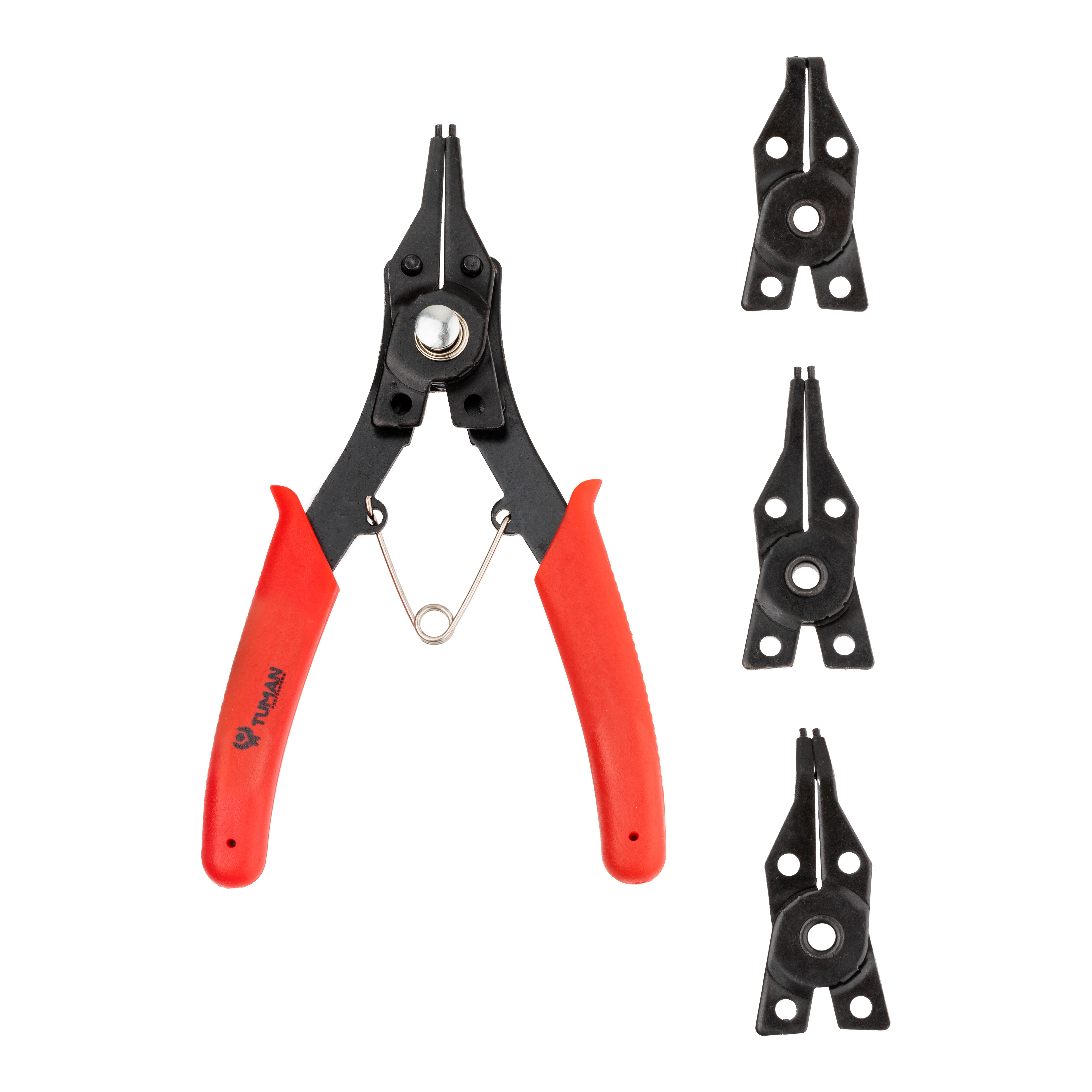 Alicate arandelas recambiable 4 cabezas: 1. Interior punta recta, 2. Interior punta curva, 3. Exterior punta recta, 4. Exterior punta curva.