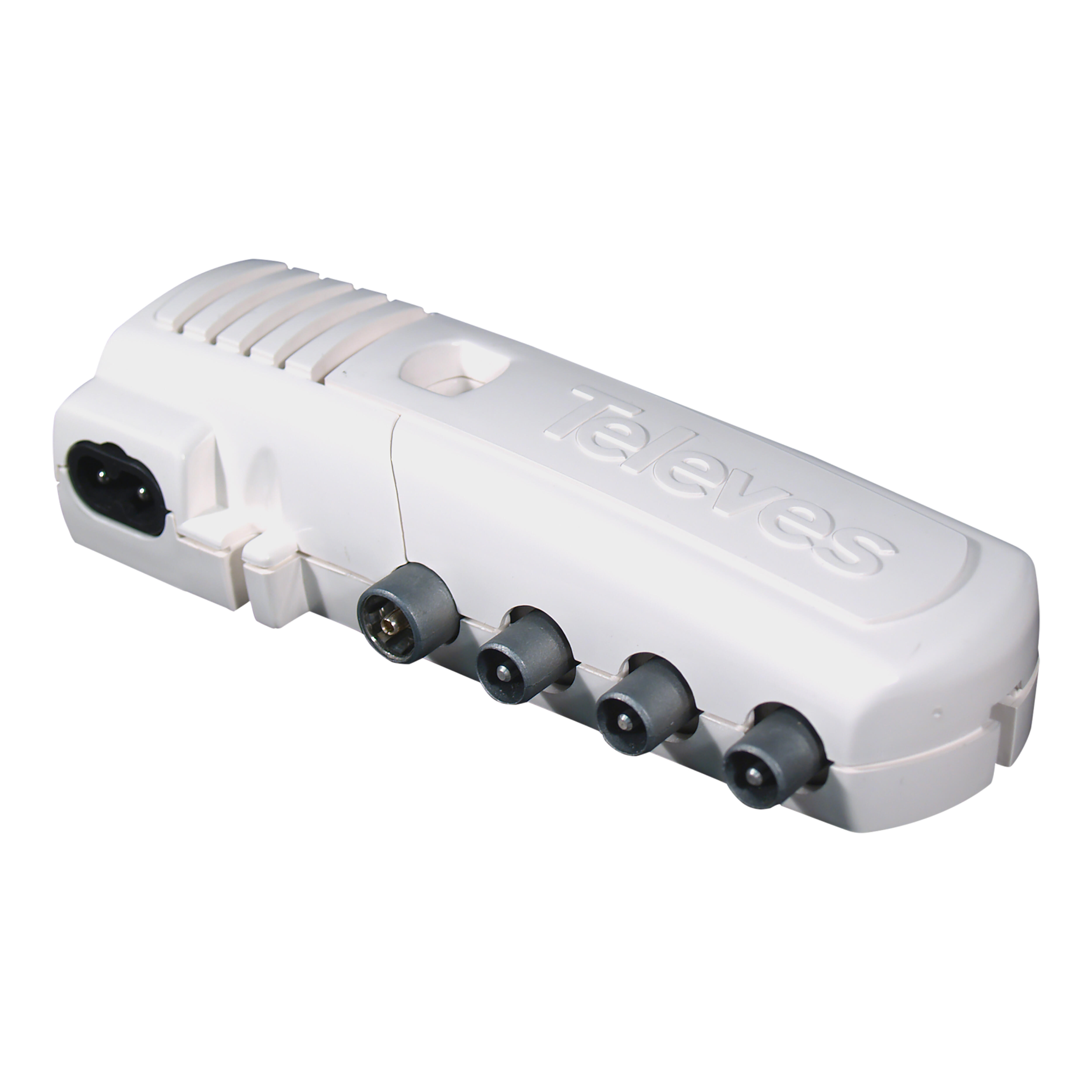 Amplificador de vivienda de 3 salidas (2+tv), para ampliar la red domestica de television terrestre. la salida tv ofrece una ganancia mas baja para ser conectada directamente al televisor (sin instalar una toma). incorpora filtrado lte790/4g. control de ganancia manual, protegidos por una tapa abatible. atornillable en pared. conectores "cei".