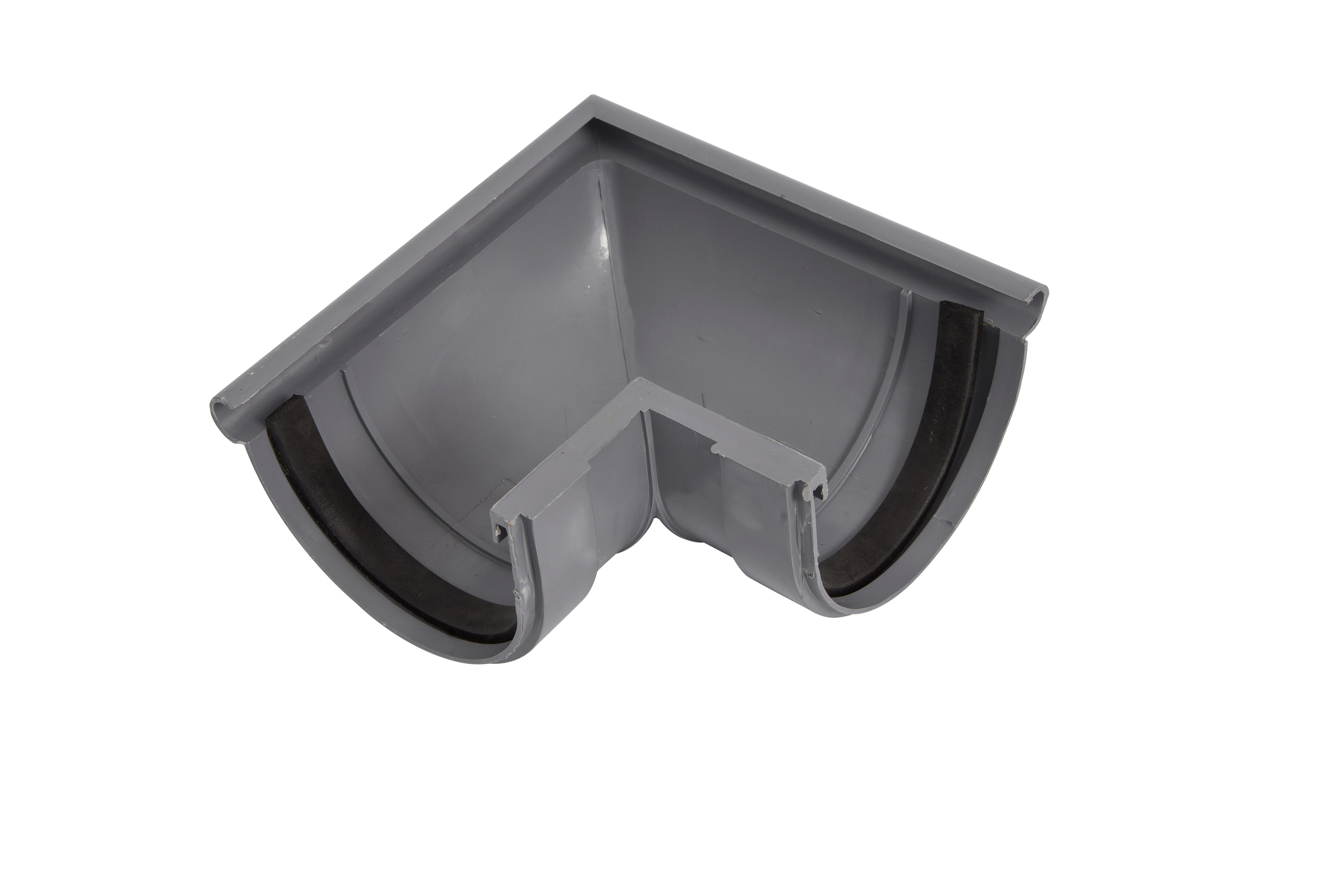 •Ángulo exterior para canalón circular. •Fabricado en PVC. •Color gris.