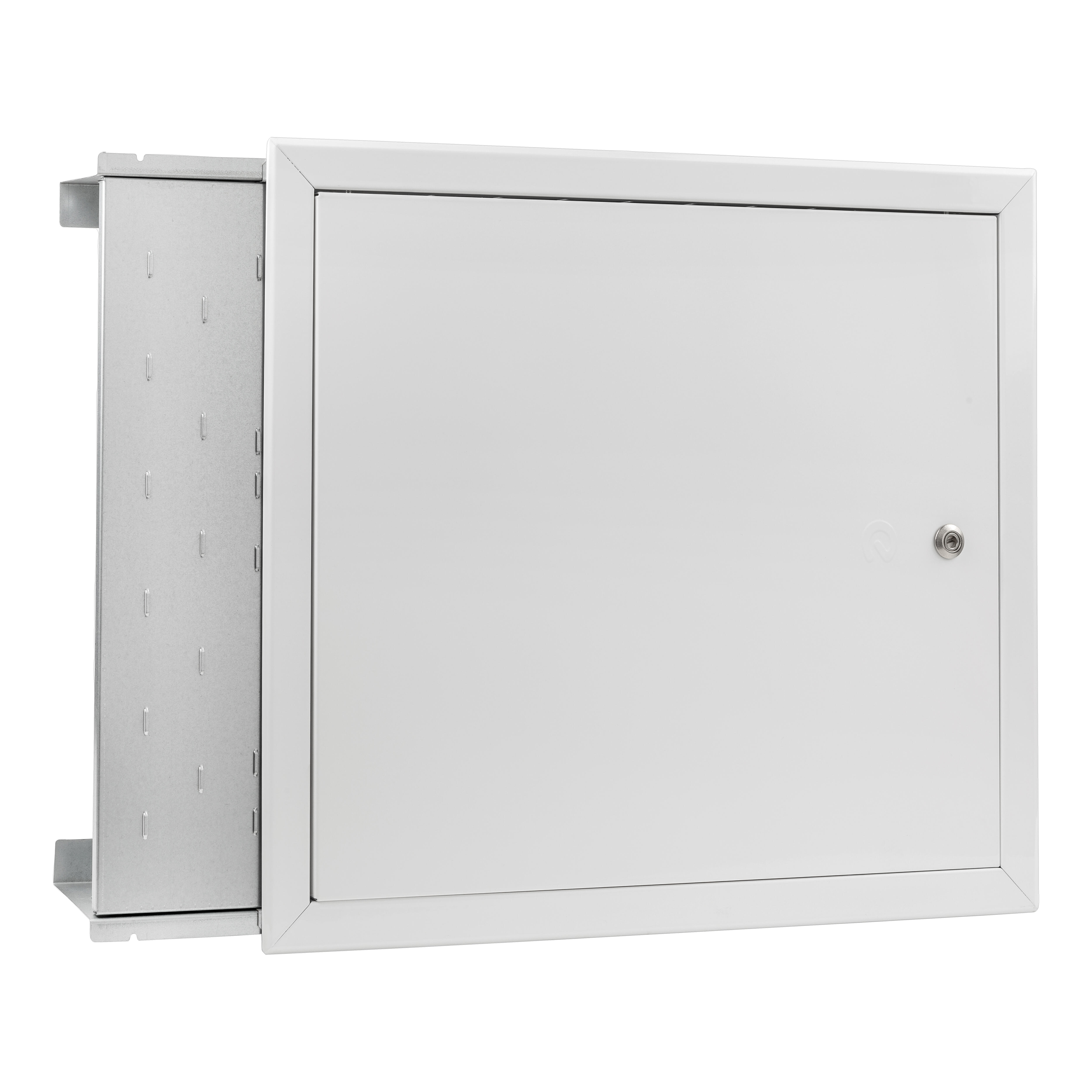 Armario de distribución de empotrar en plancha electrozincada regulable en altura y profundidad, puerta pintada con cierre de botón, frontal fijo, y soportes móviles para fijar el colector y la base.