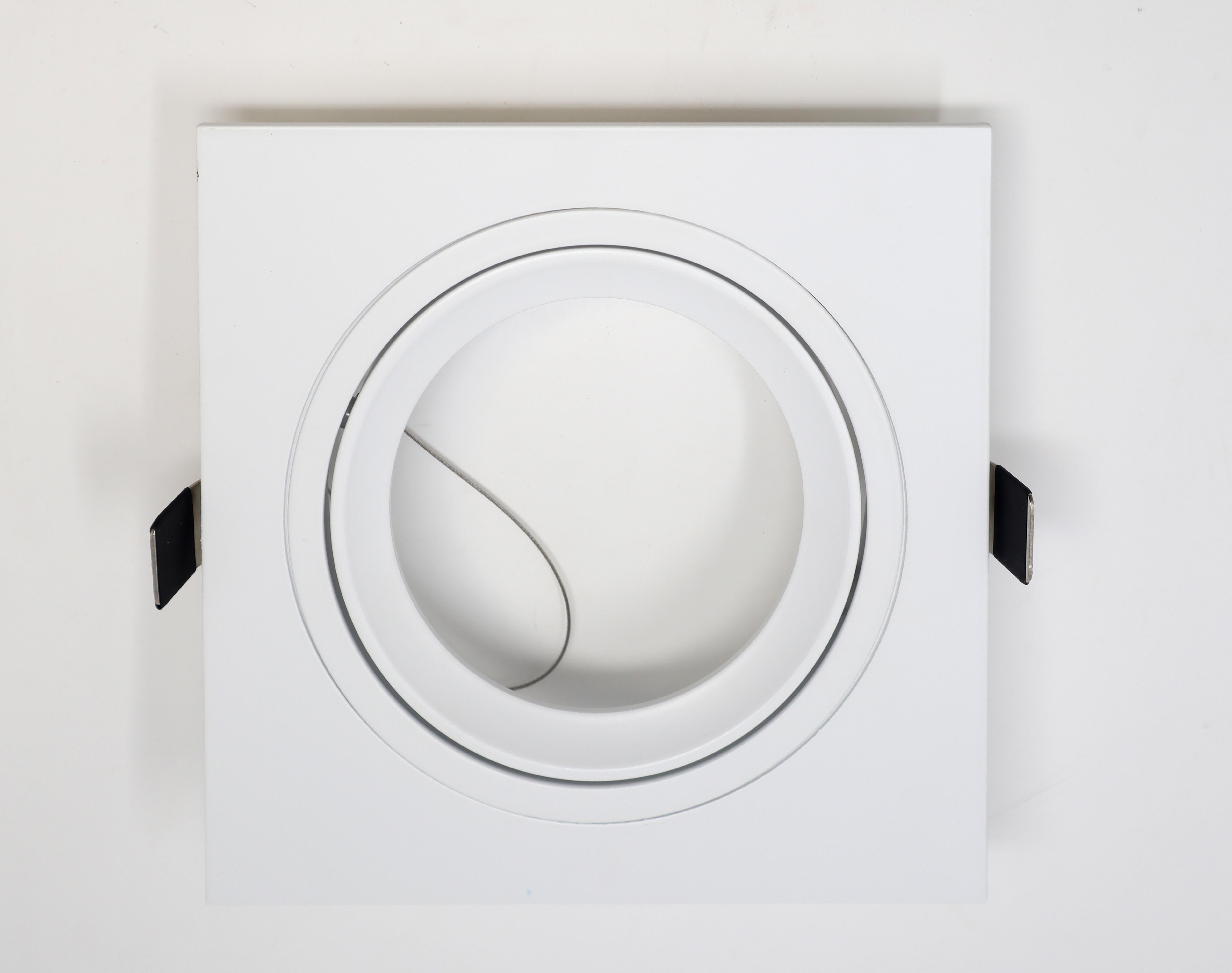 Aro basculante cuadrado para empotrar en falso techo. Medidas 17x17cm. Casquillo R111. Fabricado en aluminio acabado blanco.