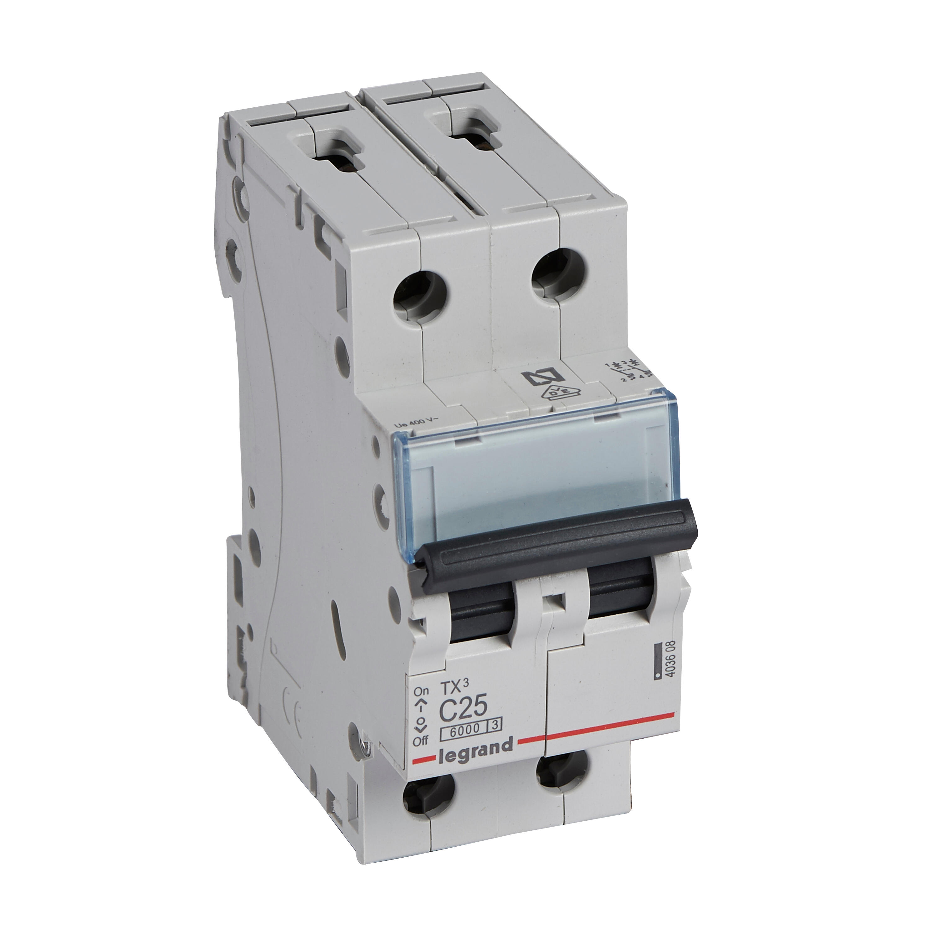 Interruptor automático magnetotérmico tx³ bipolar 230/400 v~. Curva c. Intensidad nominal: 25A. Número de módulos: 2. Poder de corte 6000a. Conforme a UNE-EN 60898-1. Tornillos imperdibles. Capacidad de embornamiento: 25mm² flexible/35mm² rígido. Conexión con bornas protegidas contra los contactos directos (IP20).