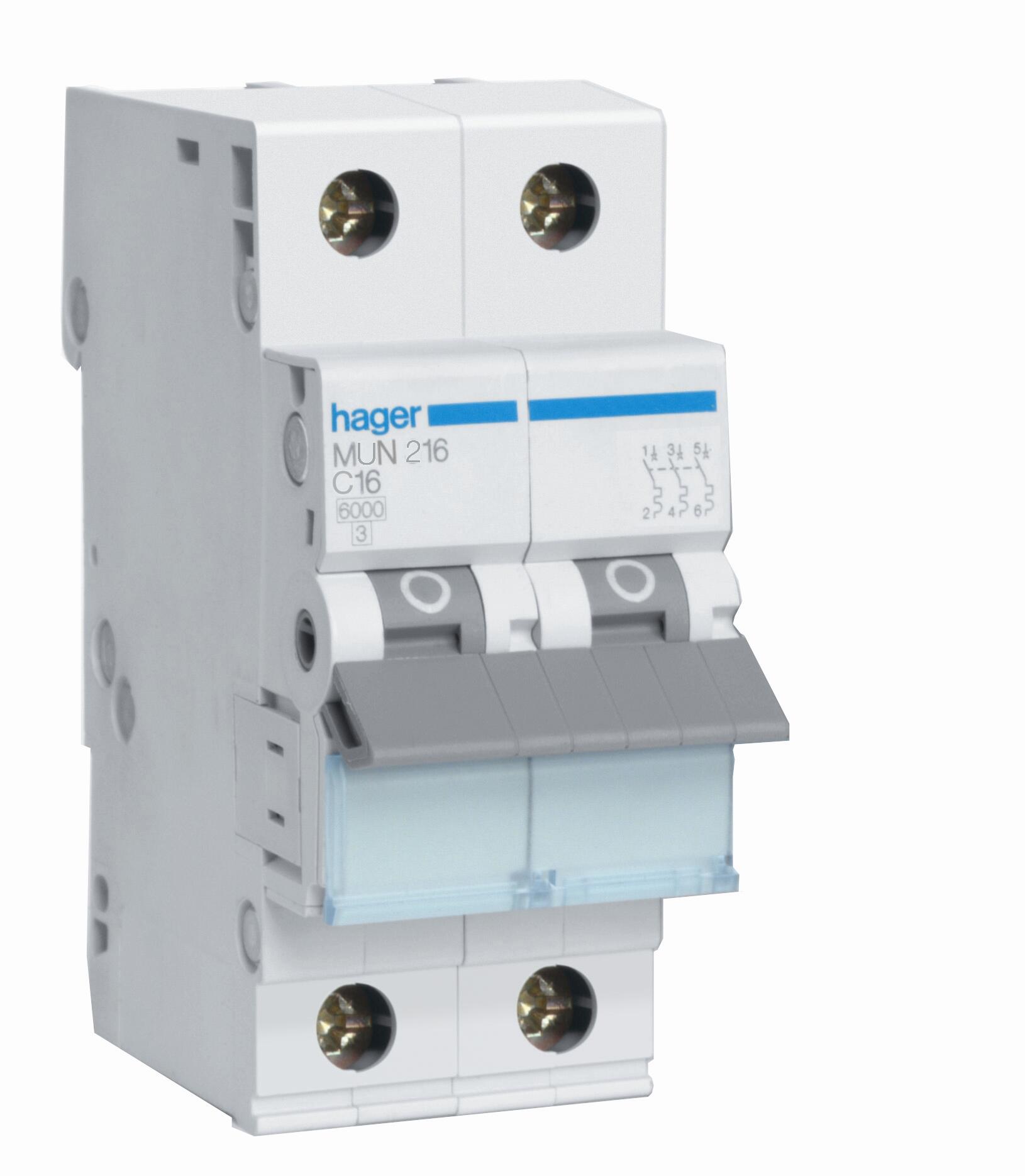 Interruptor automatico magnetotermico 2P 230 v. Curva C. Intensidad nominal 16A. 2 Módulos. Poder de corte 6000A. Conforme a UNE-EN 60898-1. Tornillos imperdibles y de cabeza mixta. Uso domestico. Montaje sobre perfil simetrico. Capacidad de embornamiento: 25mm. Marca Hager