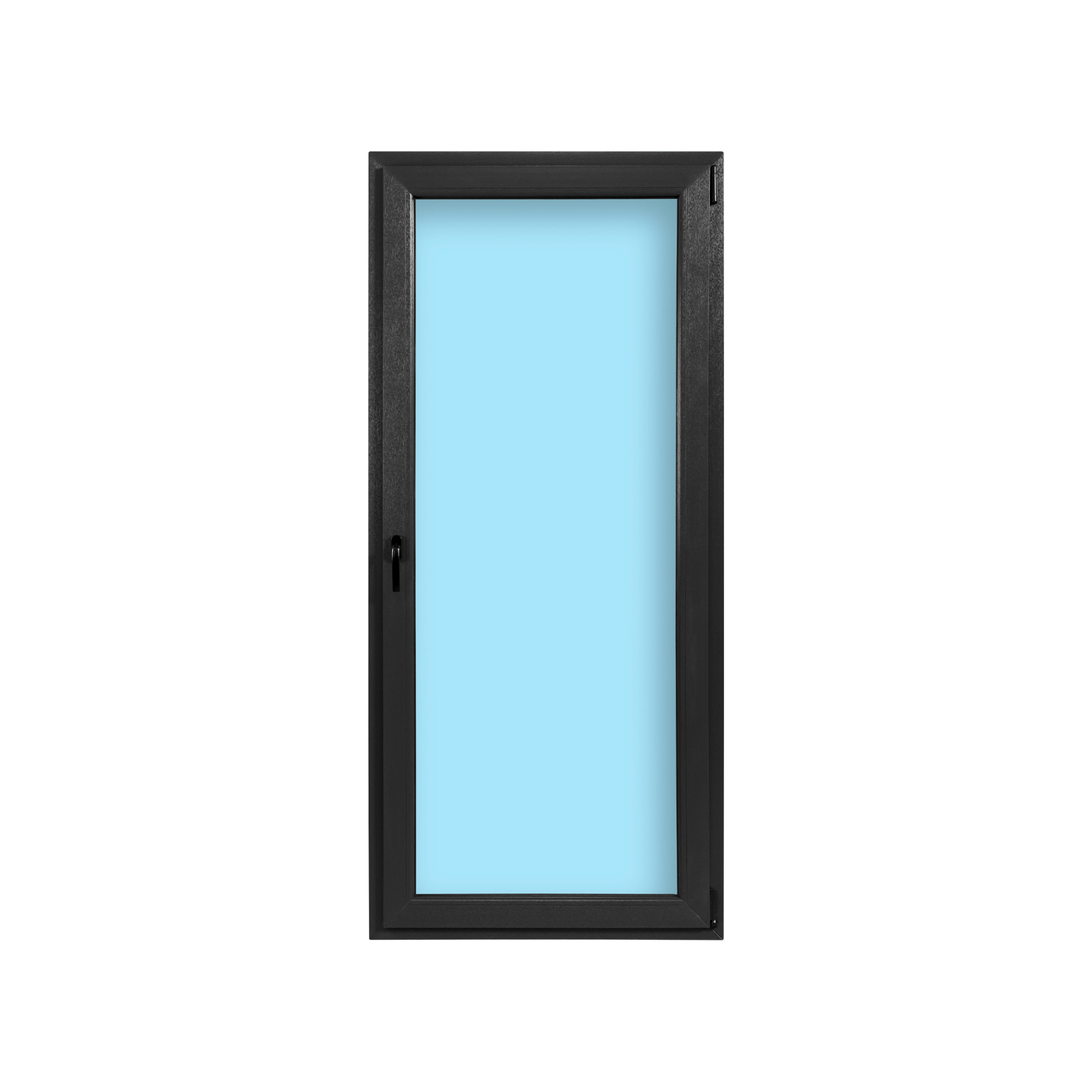 Balconera de PVC practicable gris grafito y medidas de 90x200cm. Su perfil de 60mm y tiene 4 cámaras aislantes