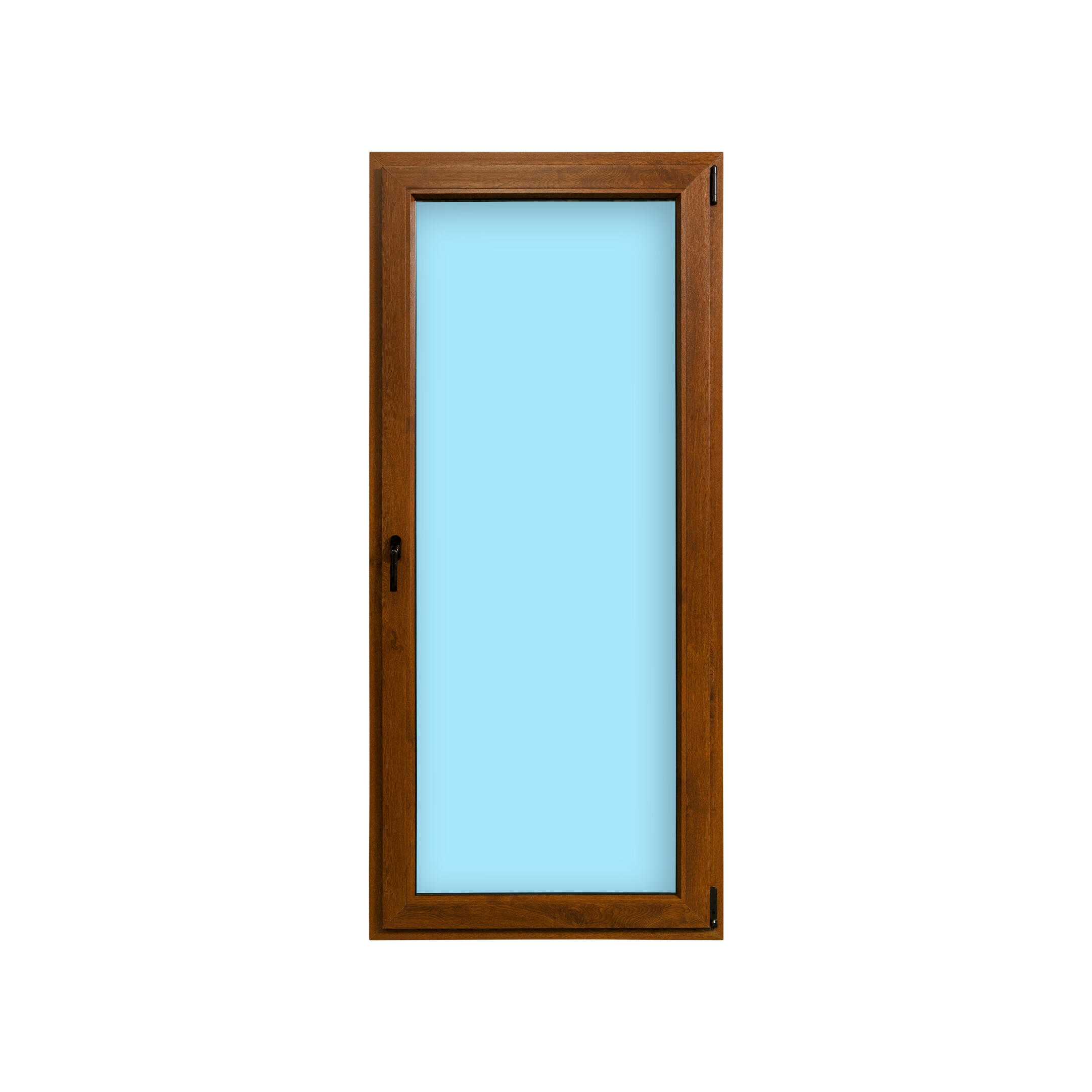 Balconera de PVC practicable, color roble y medidas 90x200cm. Perfil de 60mm tiene 4 cámaras aislantes.