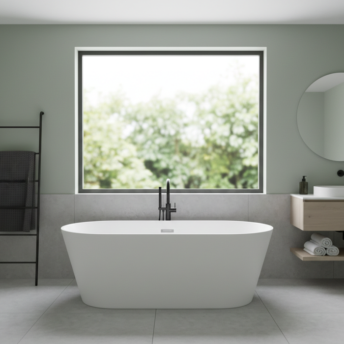 Bañera con forma ovalada de material acrílico, modelo Nassau. Color blanco. Medidas 150x76cm.