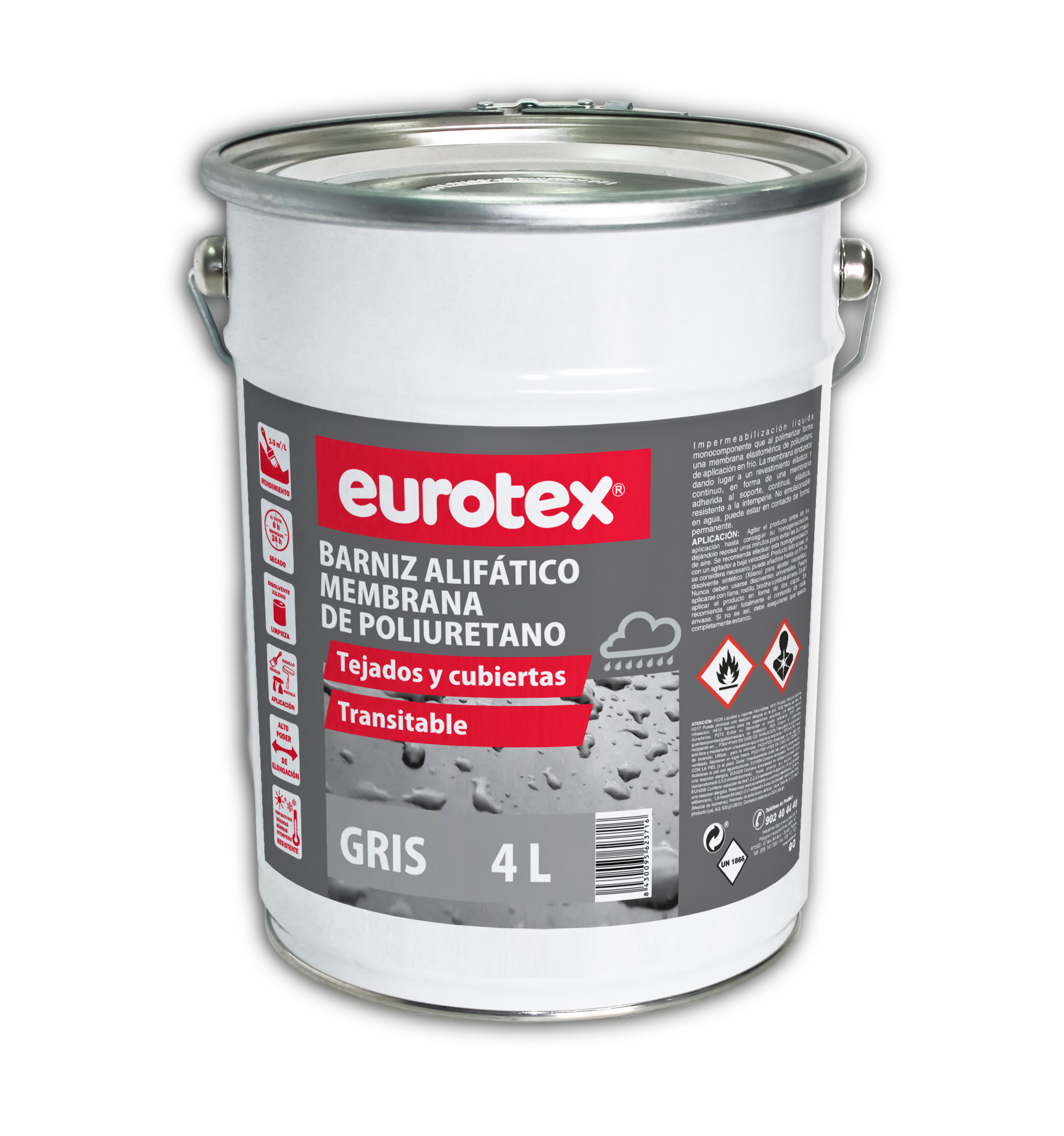 "Barniz de acabado, en base de poliuretano de un solo componente alifático para la protección de membranas de poliuretano aromáticas, asegurando la estabilidad del color. De acabado brillante, multiadherente. De rápida curación y repintado. Acabado Gris RAL7001. * Rendimiento: 0.40 - 0.60 kg/m2 * Secado al tacto: 2 horas * Repintado: antes de 24 horas * Herramientas de aplicación: Brocha, rodillo, pistola, pistola Airless"