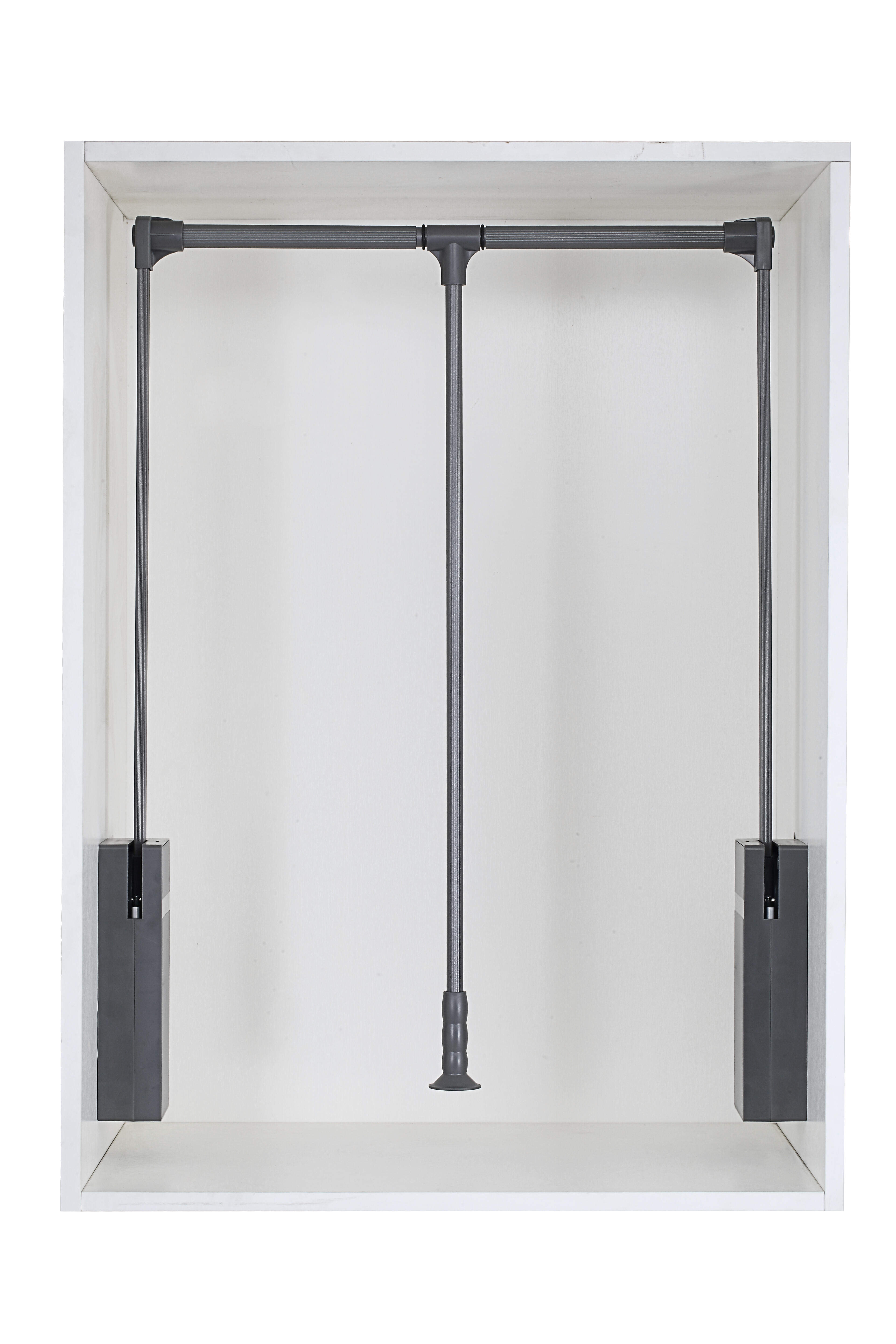 Perchero abatible para interior de armario, que es compatible con los interiores de armario superiores a 83 cm de hueco libre, fabricado en acero, a traves de su sistema abatible permite bajar la barra que soporta las prendas un metro hacia el suelo. El tirador ergonómico facilita la función del perchero siendo una solución muy adecuada para personas con problemas para acceder a una barra habitual.