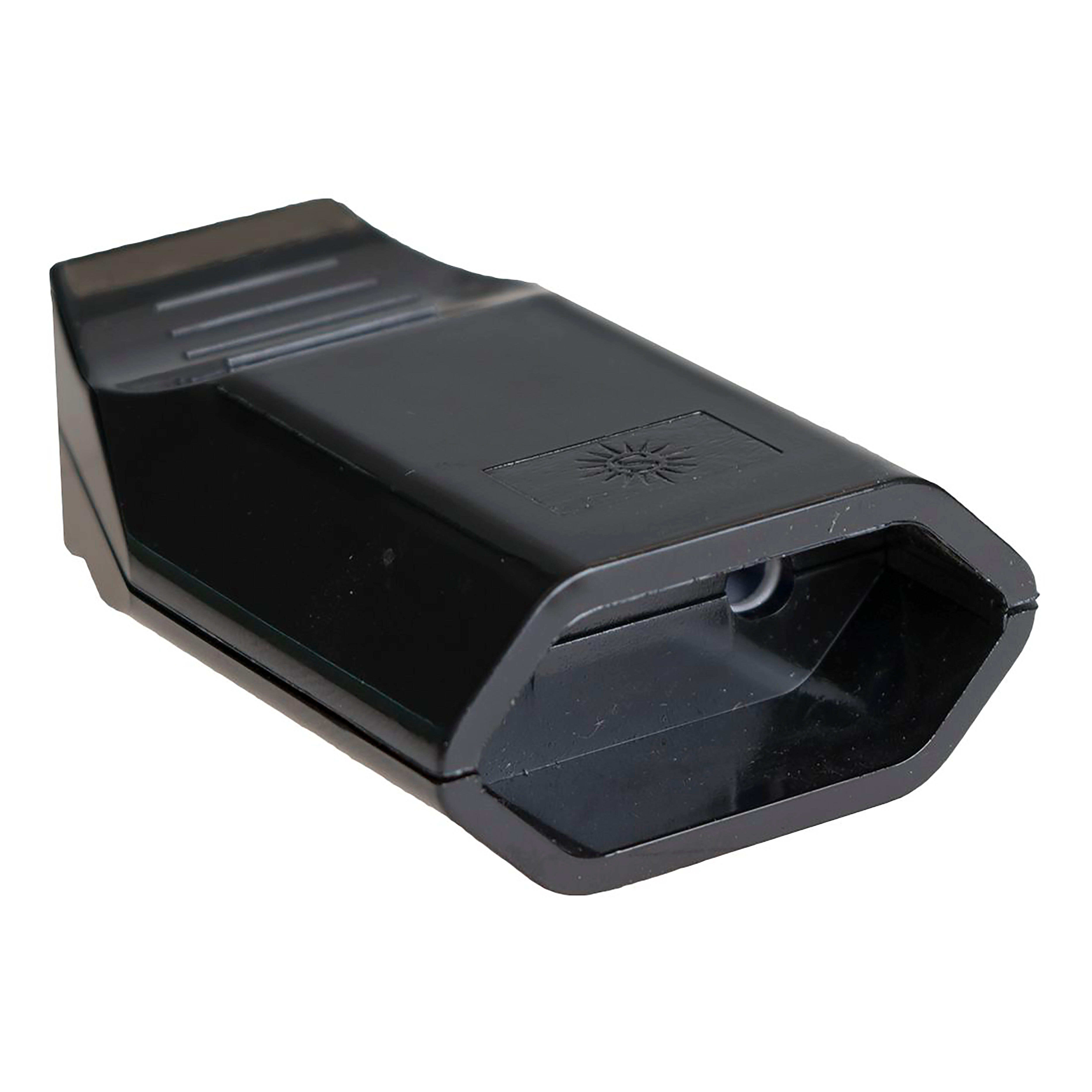 Base móvil de enchufe bipolar 10A 250V con obturador material termoplástico en color negro con pozo de protección. Resistencia al fuego (Ensayo de hilo incandescente 750ºC). Resistencia al calor (Ensayo de presión a la bola 125ºC). Material aislante libre de halógenos.