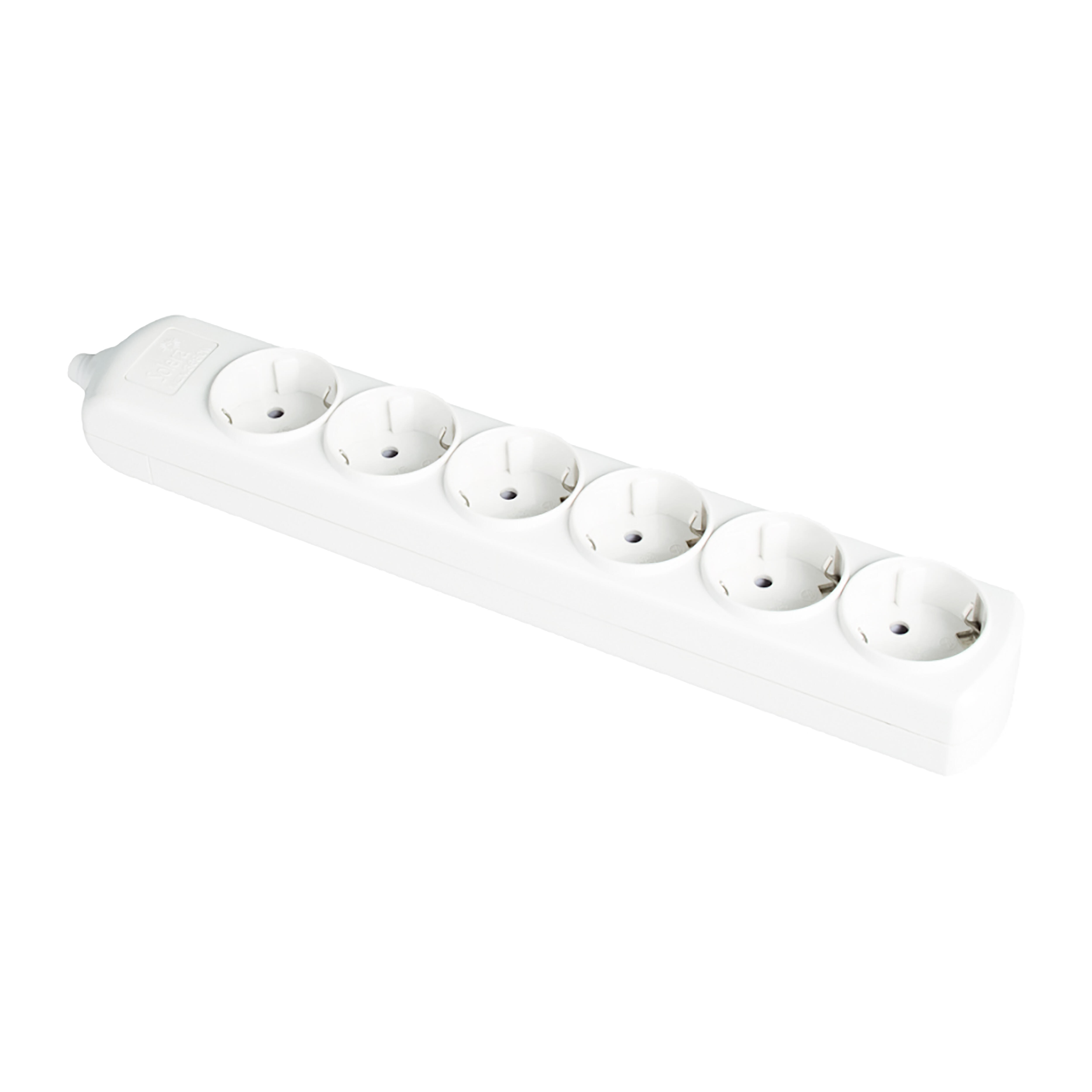 Base de 6 tomas bipolar con toma de tierra lateral, material termoplástico blanco, sistema de fijación a la pared sin necesidad de abrir la base, potencia máxima admisible 3680W, 2 polos, 16A 250V. Certificado Intertek.