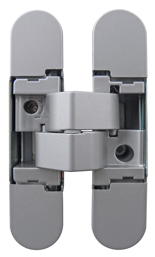 Bisagra oculta realizada en acero y zamak con acabado plateado