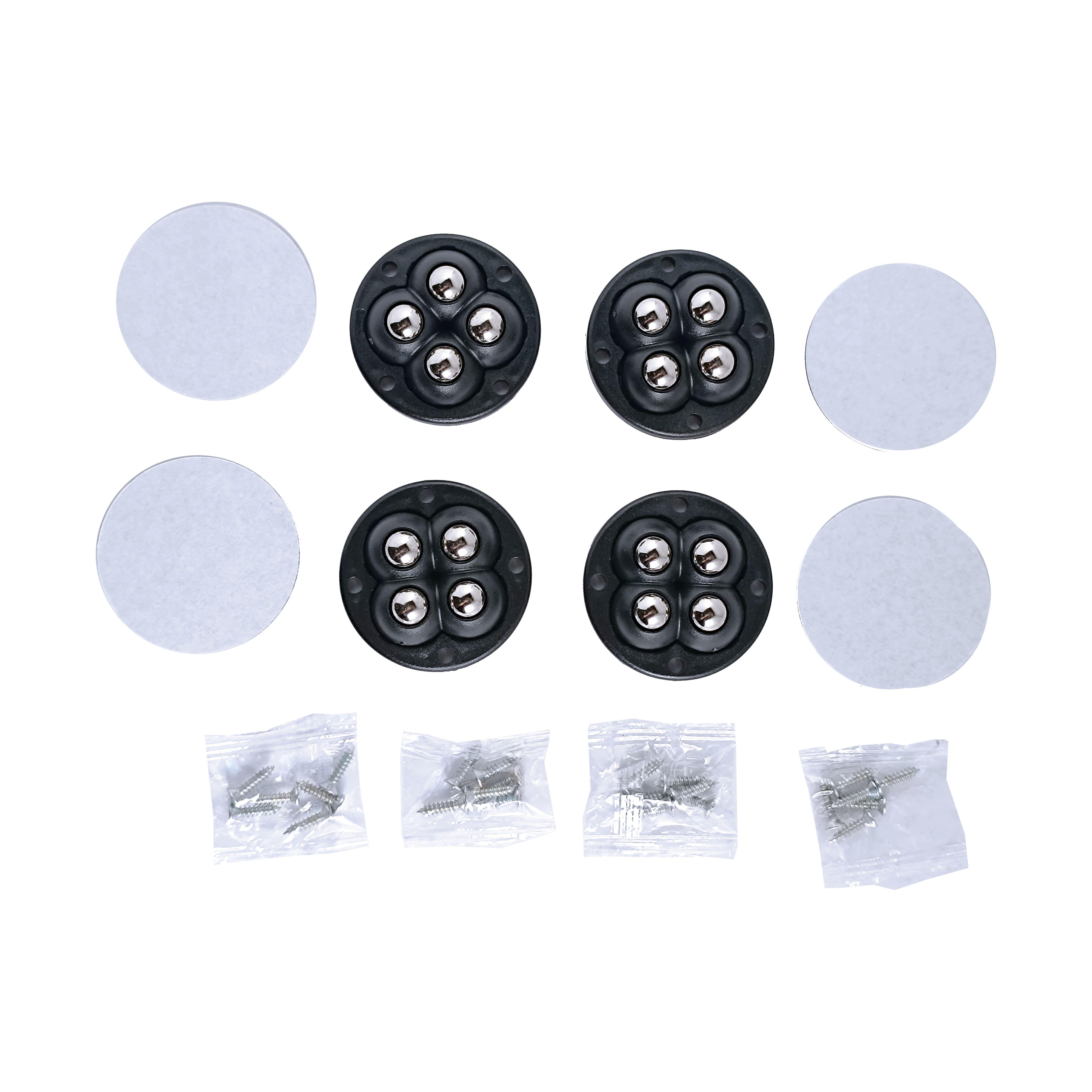Conjunto de 4 ruedas tipo bola de rotación libre 360°, fabricadas con núcleo reforzado para soportar hasta 35 kg por unidad.