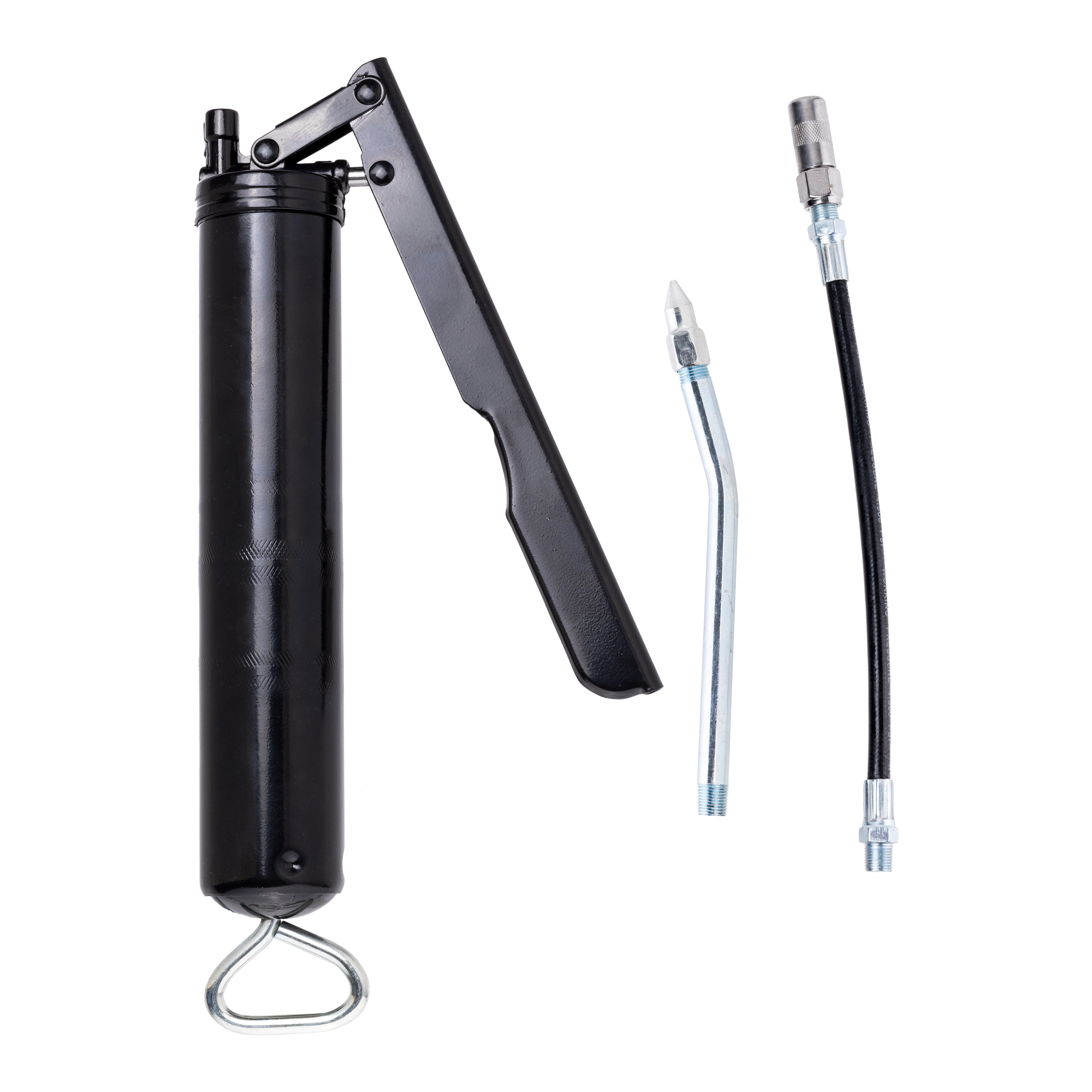Bomba de engrase con latiguillo. Manguito extraible de 300 mm, manguito fijo de 170 mm. Cuerpo metálico largo, válvula anti-obturación. Capacidad 400cc. 280mm.
