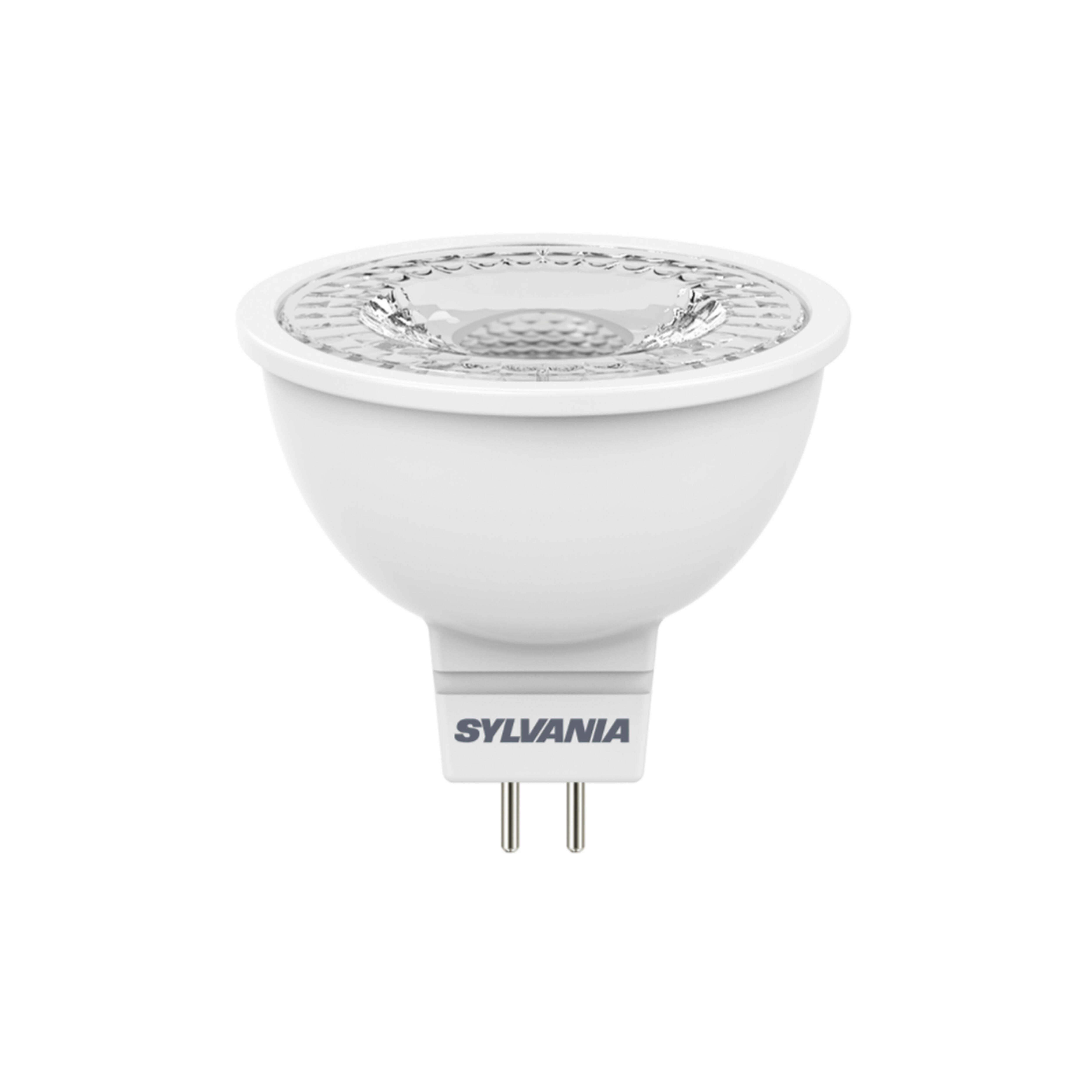 Bombilla LED Dicroica 4,3W de la marca Sylvania, casquillo GU5.3 y luz fría (6000ºK). Compacta y eficiente ideal para aplicaciones en oficinas, hostelería, residencial y comercio.