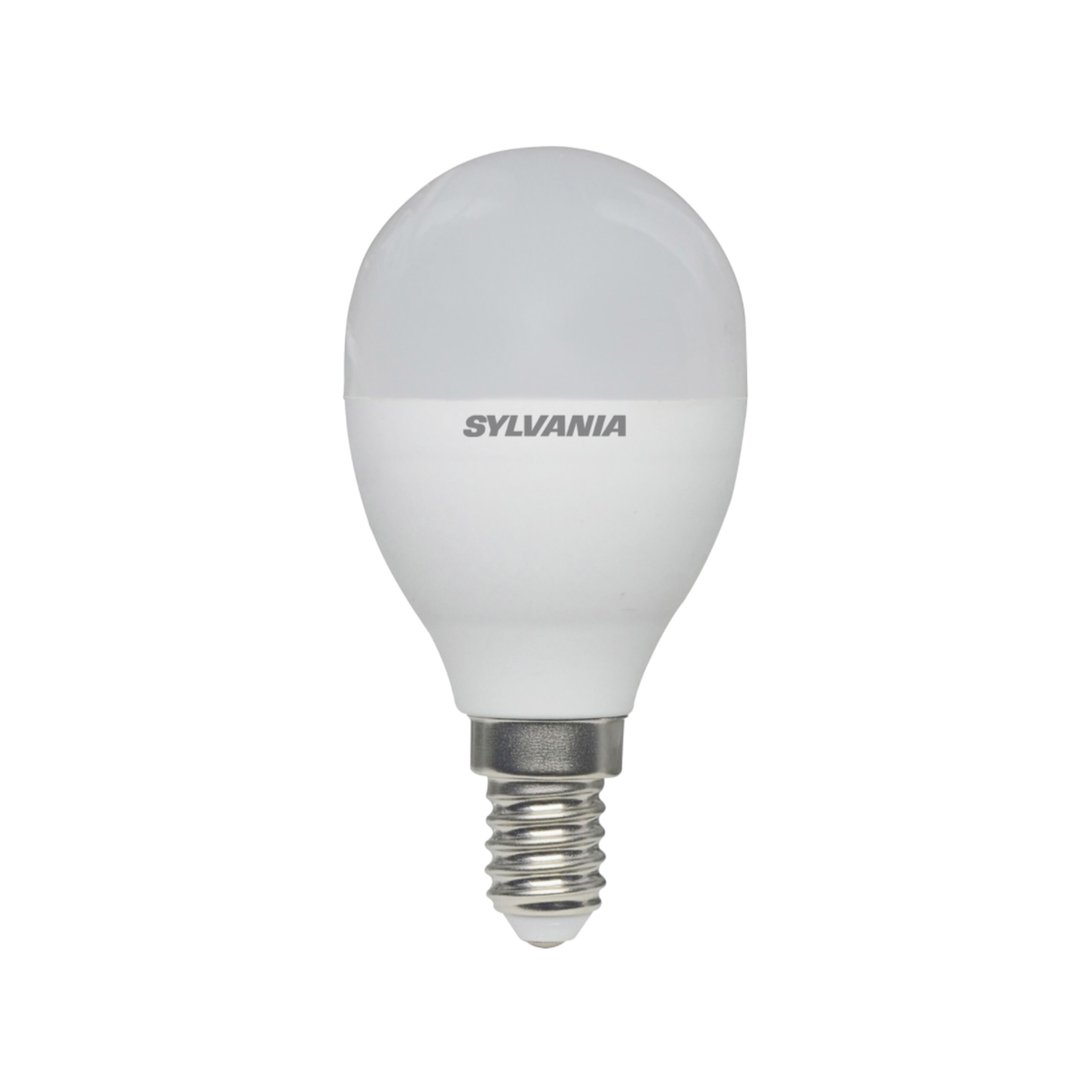 Bombilla LED esférica 6,5W de la marca SYLVANIA, casquillo E14 y luz cálida (2700ºK).