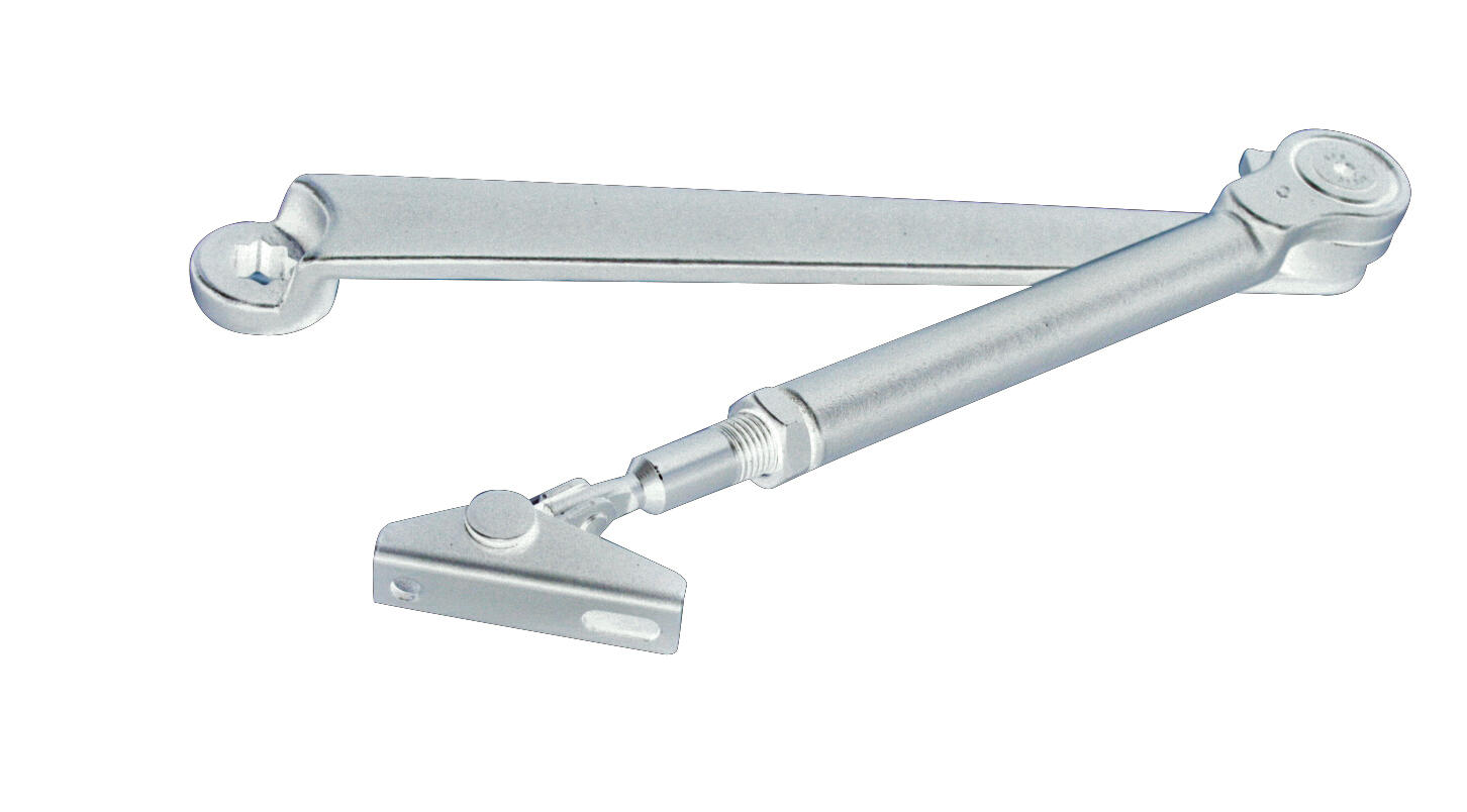 Brazo de retención cierrapuertas plateado ajustable de gama alta, con mecanismo piñón cremallera, cuerpo compacto y ligero de aluminio fundido. Es completamente reversible, con cierre por acción de fluido hidráulico y viscosidad termo constante. Doble ajuste de la velocidad de cierre y del golpe final, mediante dos tornillos sin necesidad de desmontarlo. Control de puerta para aperturas de hasta 180º. Certificado CE EN 1154 para puerta cortafuego.