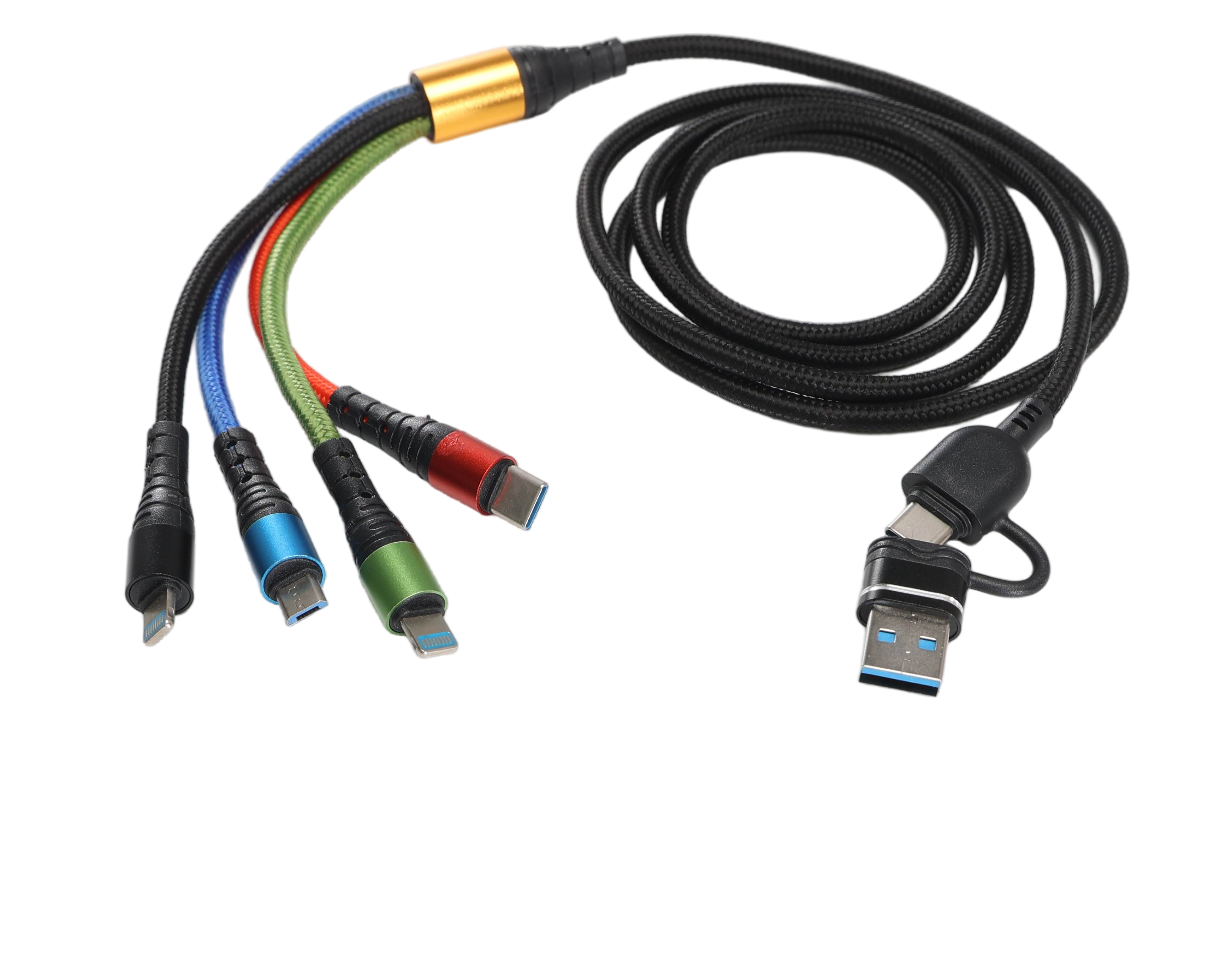 Tipo de entrada USB-A y USB-C con salida tipo Lightning, micro-USB y USB-C. Cubierta trenzado de Nylon.