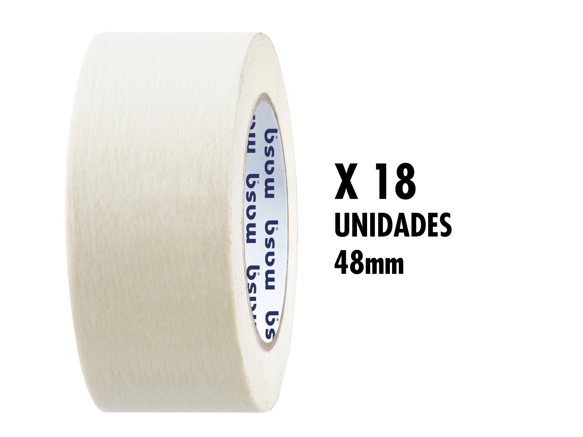 Caja de Cinta autoadhesiva con soporte de papel y adhesivo de caucho natural en base disolvente. Cada caja contiene 18 unidades.