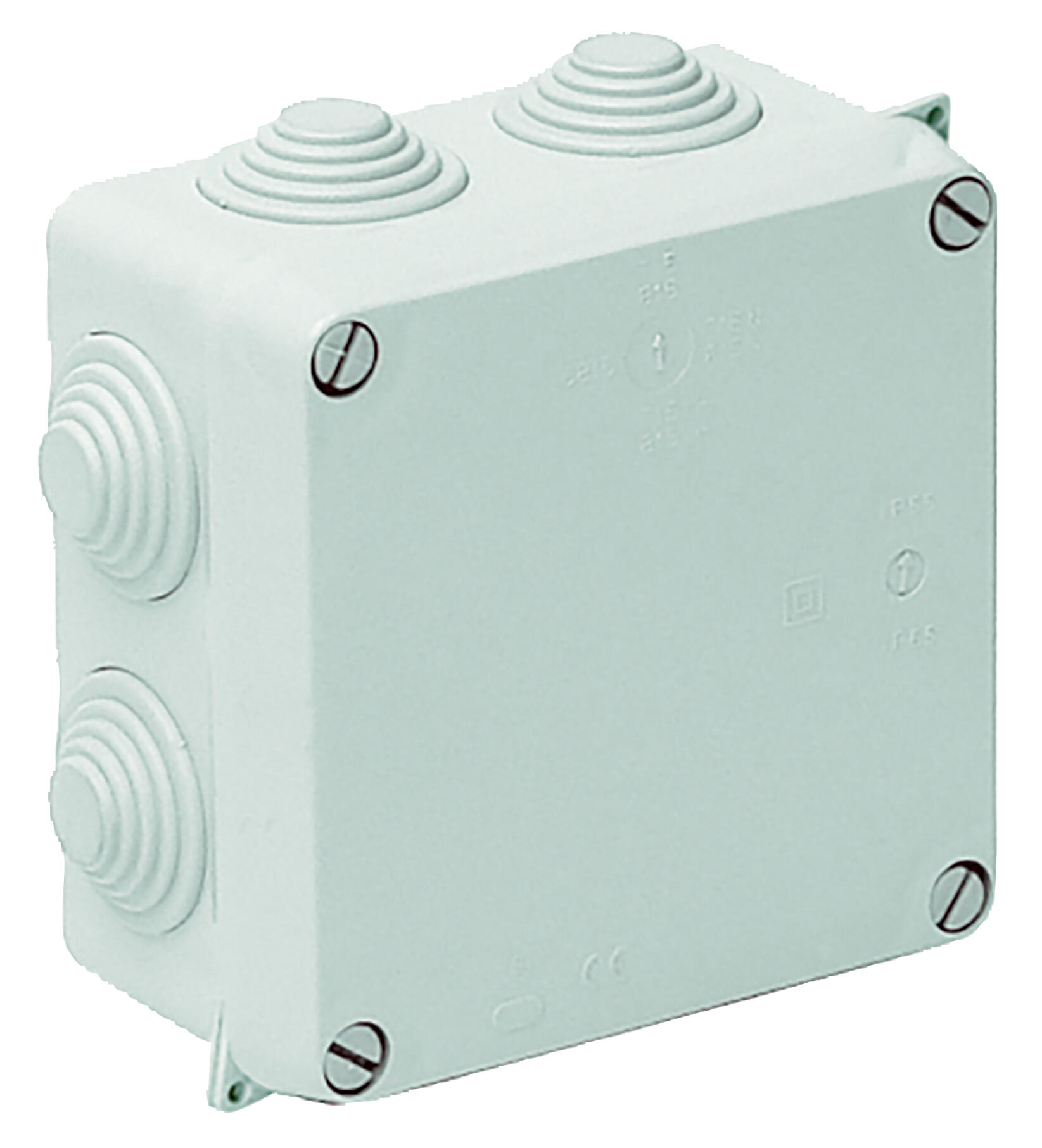Caja de registro eléctrico estanca 110x110x60mm para superficie de exterior con tapa de tornillo. Con 7 conos para tubo ø máximo 25(m25). Cajas previstas para su utilización en el exterior. IP55 grado de protección: IK08. Precintables..