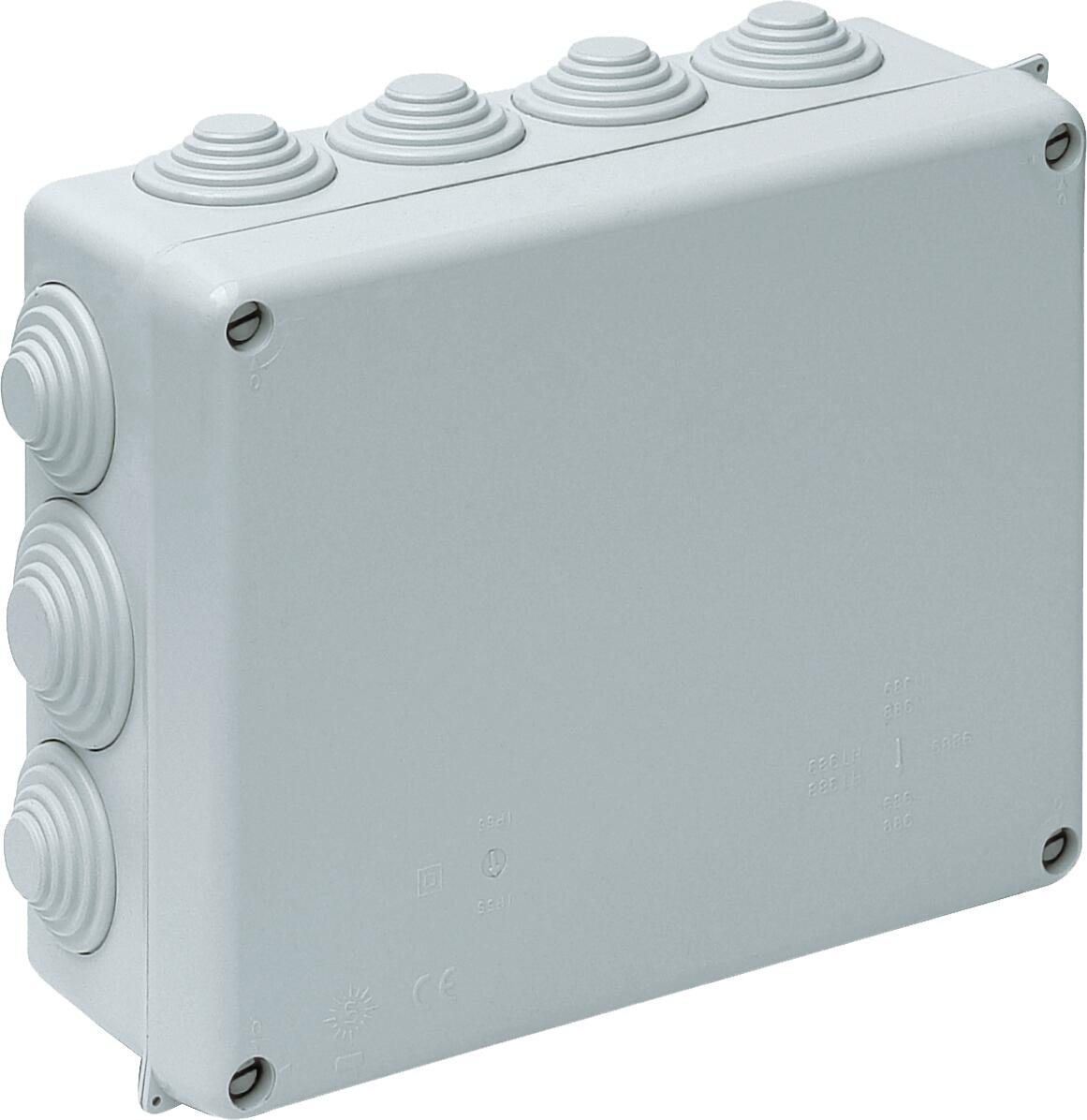 Caja de registro eléctrico estanca 220x170x80mm para superficie de exterior con tapa de tornillo.Caja estanca con conos. IP55. IK09. 220x170x80. 12 conos para tubo ø máximo 32 (m32) y 2 conos para tubo ø máximo 40 (m40). Precintable. Material termoplástico.