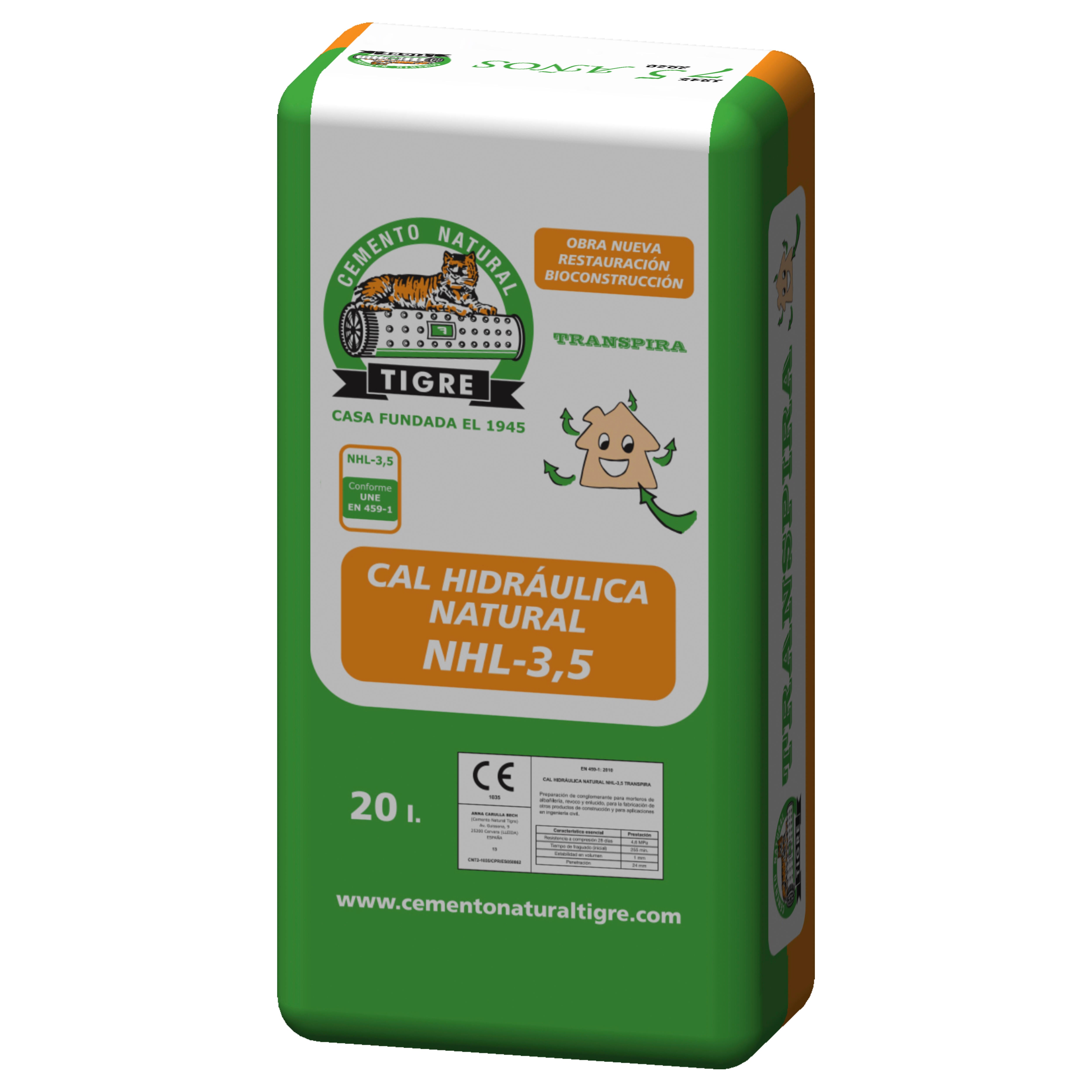 Cal Hidráulica natural NHL-3.5 TIGRE. Gran plasticidad y trabajabilidad con una fuerte adherencia a las superficies que permite trabajar cómodamente y eficazmente con el producto. Poca tendencia a la fisuración. Impermeabilidad al agua y permeabilidad al vapor de agua que permite que las superficies enfoscadas con morteros de Cal Hidráulica Natural TIGRE transpiren. Excelentes propiedades hidráulicas que favorecen trabajar en ambientes con alta humedad sin necesidad de añadir Cemento.