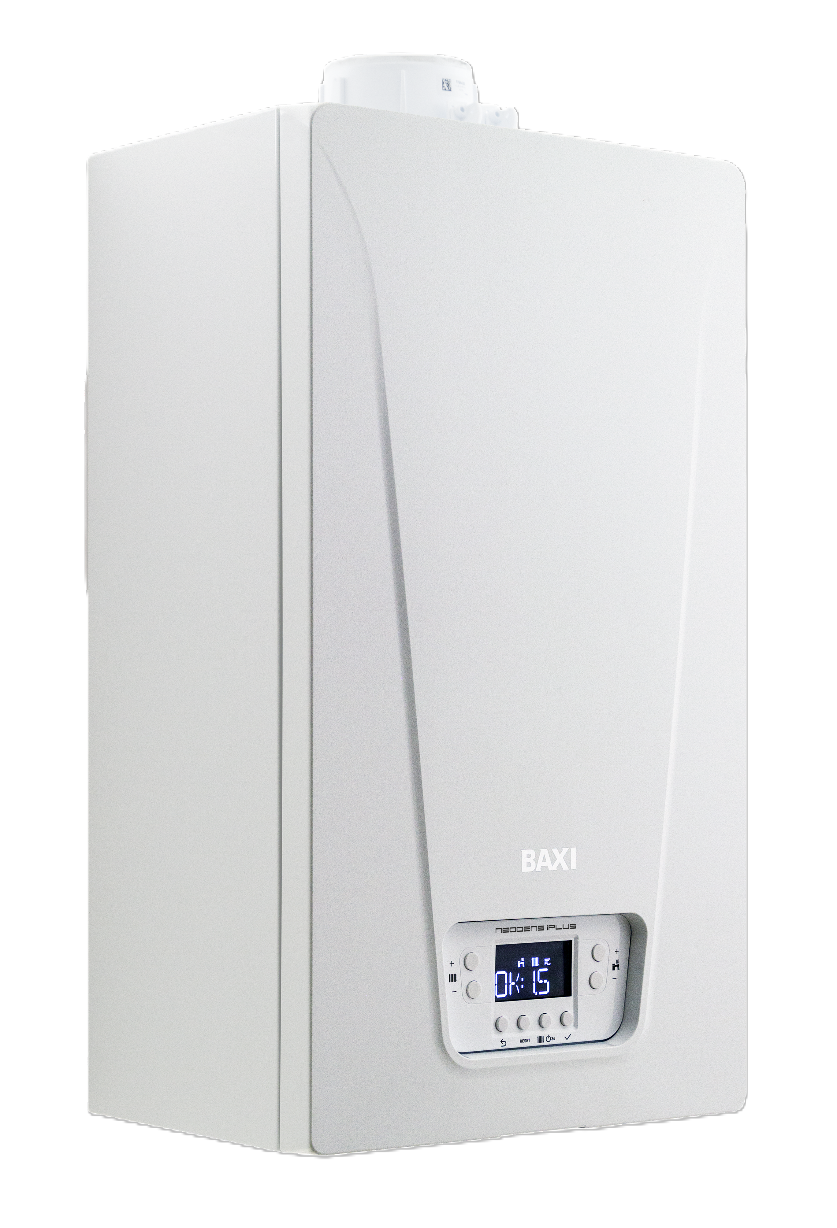 Caldera de gas Baxi Neodens IPlus 28. Potencia de calefacción: 24kW y potencia ACS de 28kW. Superficie calefactable: 180m2 aproximadamente. Indicada para dos duchas.