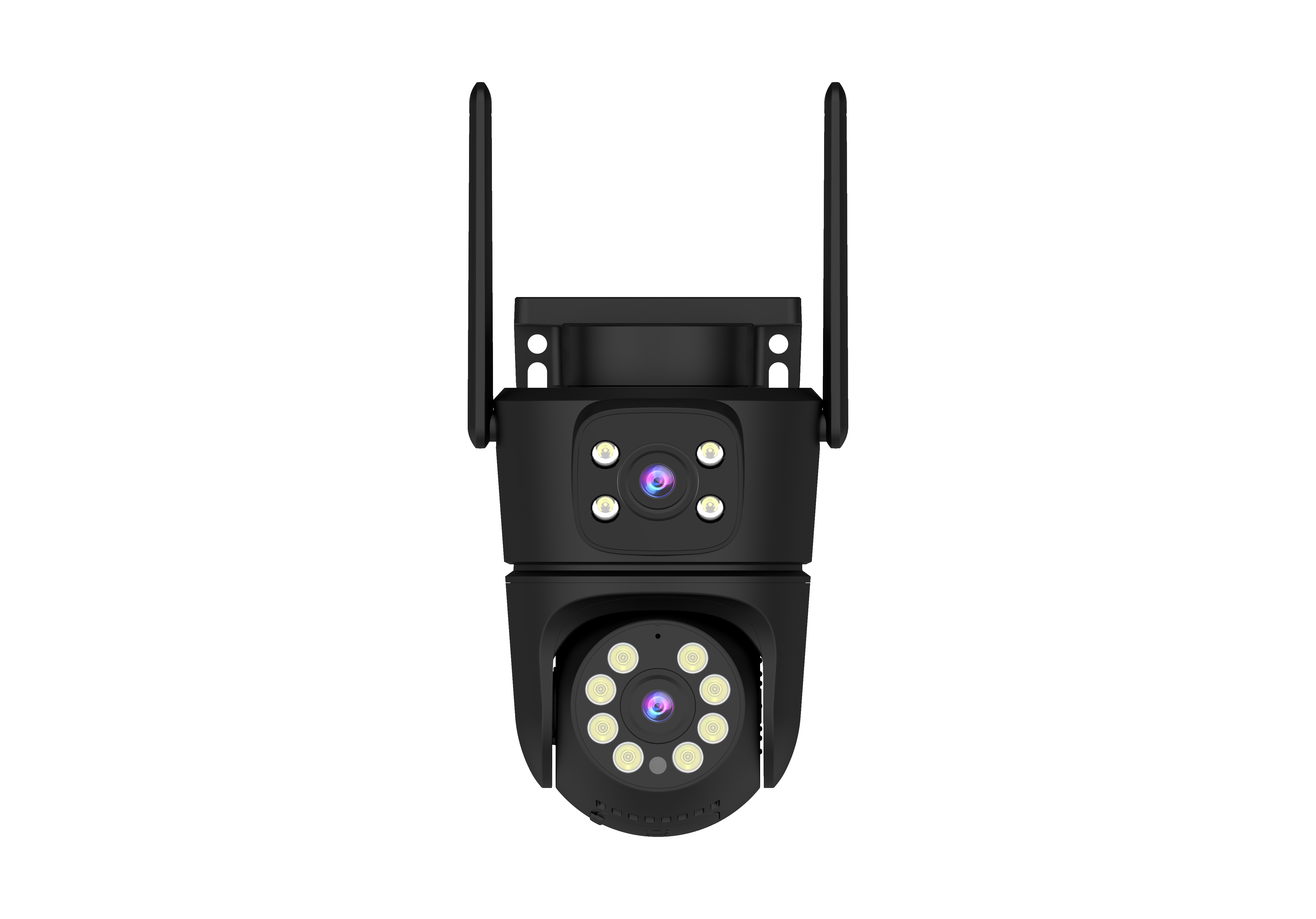 Cámara IP exterior doble lente wifi motorizada negro. Detección de movimiento con filtro IA de humanos que reduce falsas alarmas. Comunicación bidireccional entre cámara y aplicación móvil. Movimiento horizontal de 355º y vertical de 110º motorizado, seguimiento automático al detectar movimiento. Con 3 opciones de detección. Control desde aplicación móvil Tuya Smart o Smartlife.