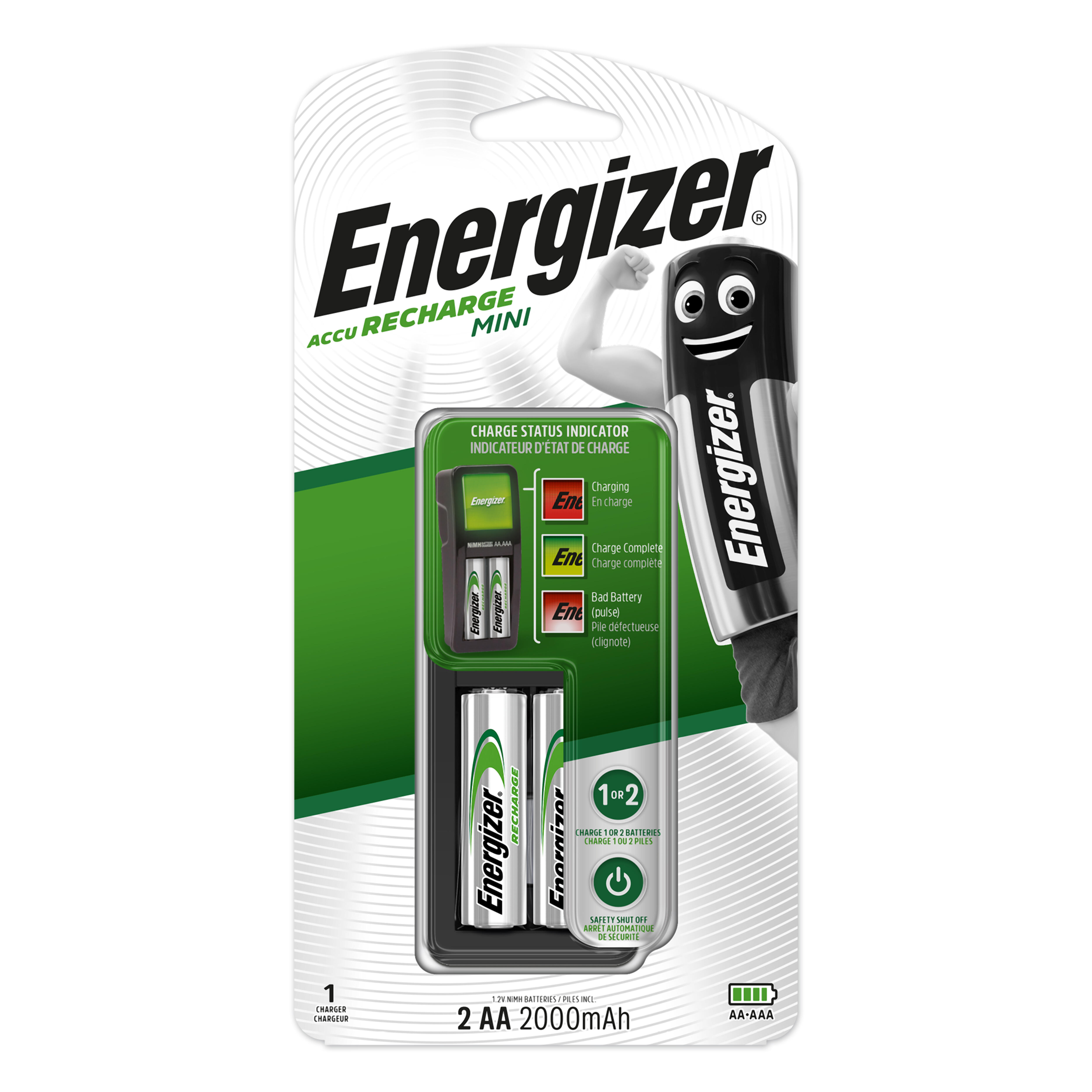 Cargador de pilas Alcalinas + 2 pilas recargables AA. Apto para pilas AA y AAA. 2000mAh. Cuenta con indicador de carga.
