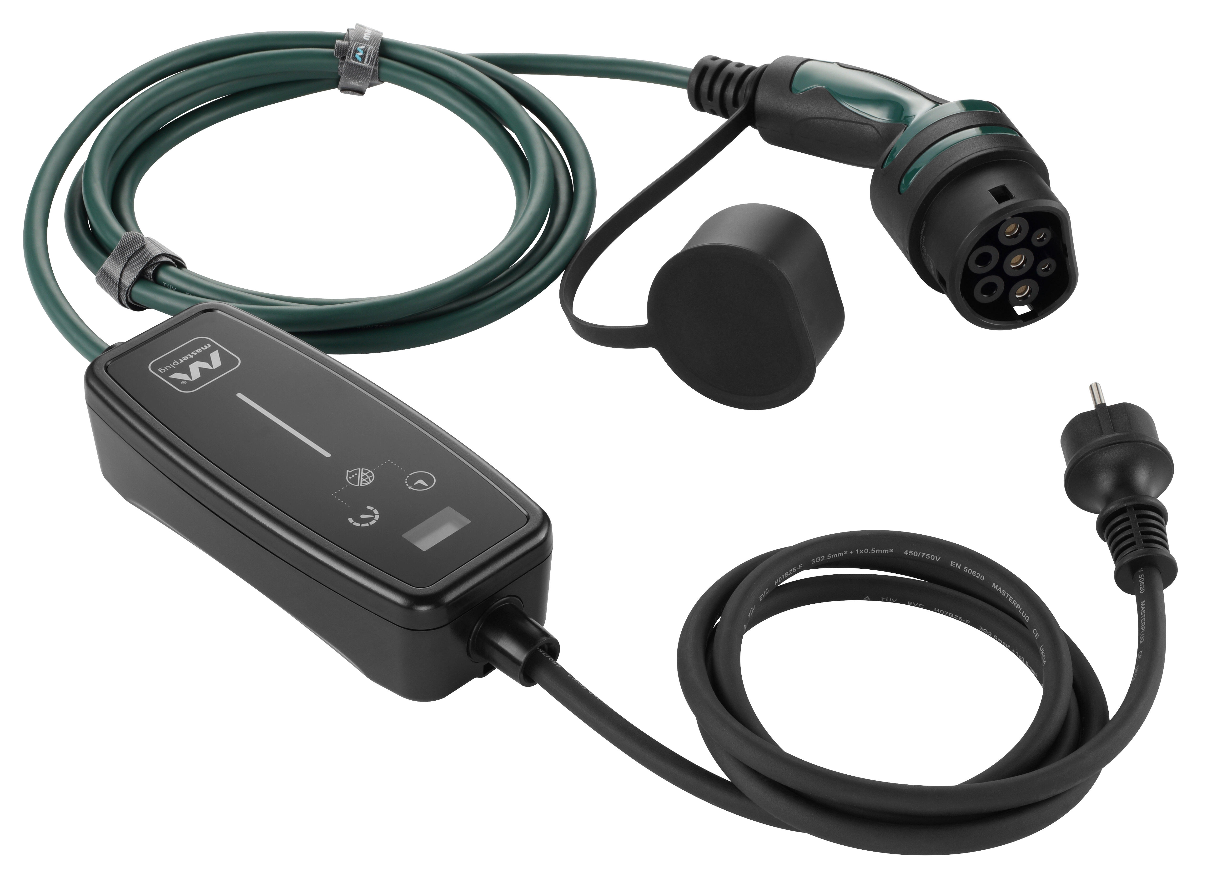 Cargador vehículo eléctrico monofásico 3.6kW portátil con conector tipo 2 a enchufe schuko de 16A.