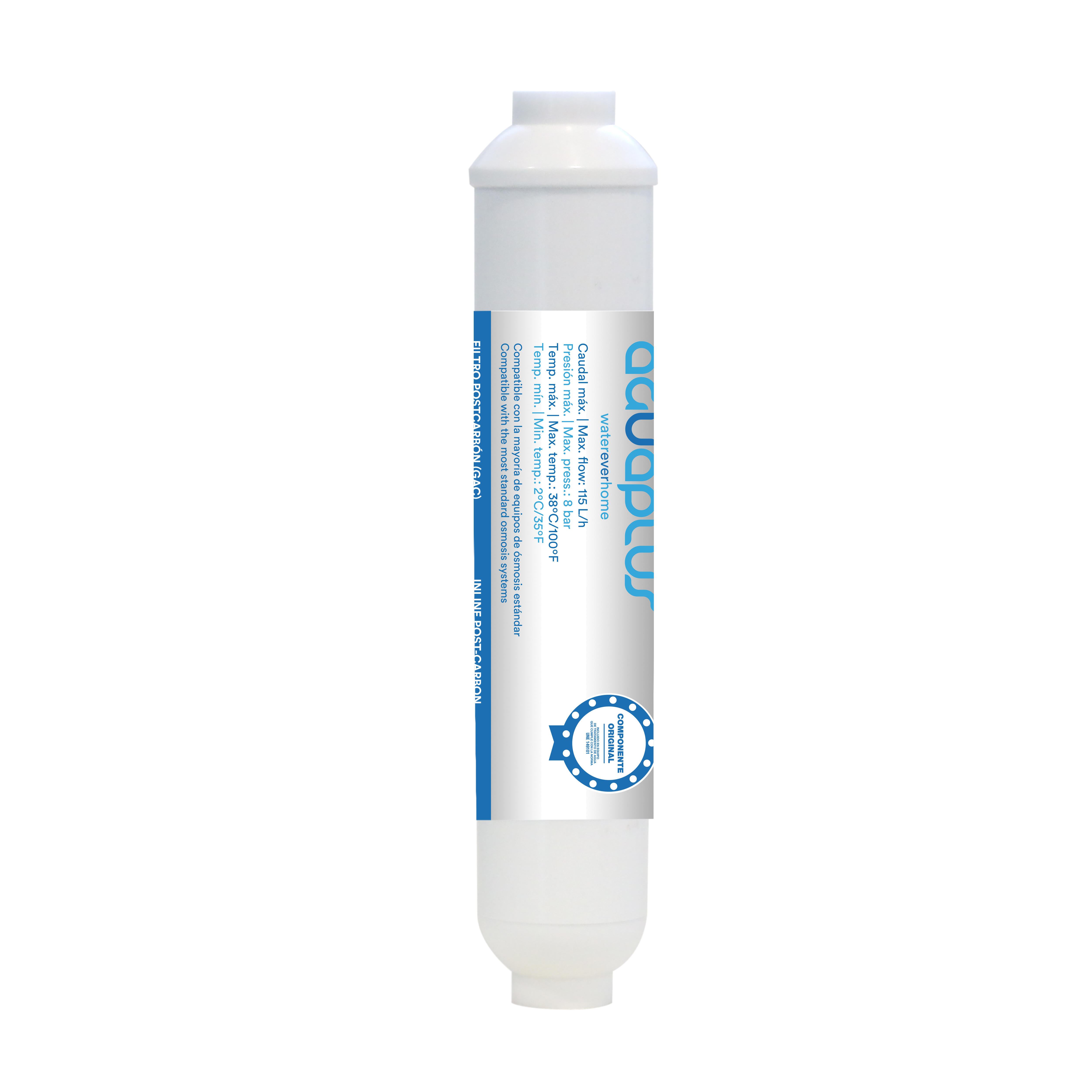 Cartucho filtrante de carbón activado granulado de 10" de rápido montaje. Filtra las sustancias del agua corriente: ozono, pesticidas, óxido, cal y cloro.