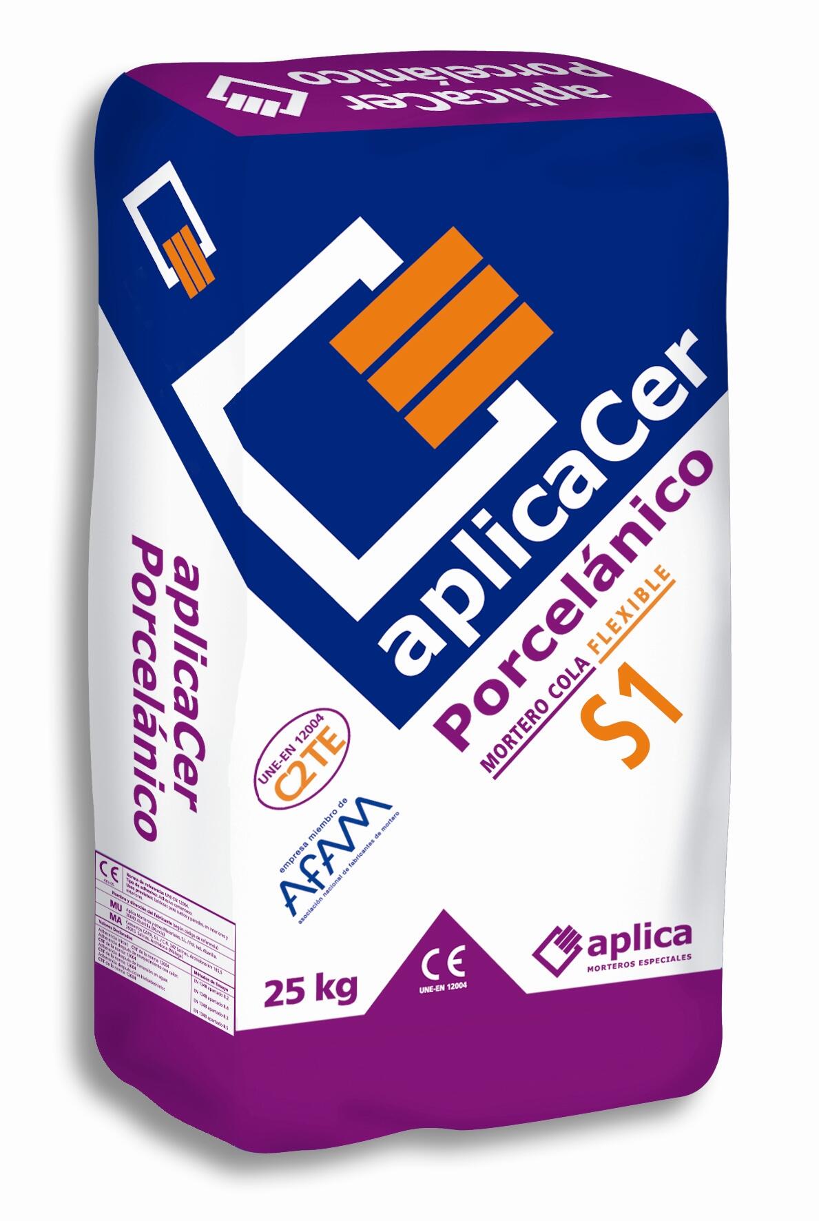 El cemento cola Aplicacer es un adhesivo de ligantes mixtos deformable, para la colocación de gres porcelánico en interior y exterior. Sacos de 25 kg. Color gris.