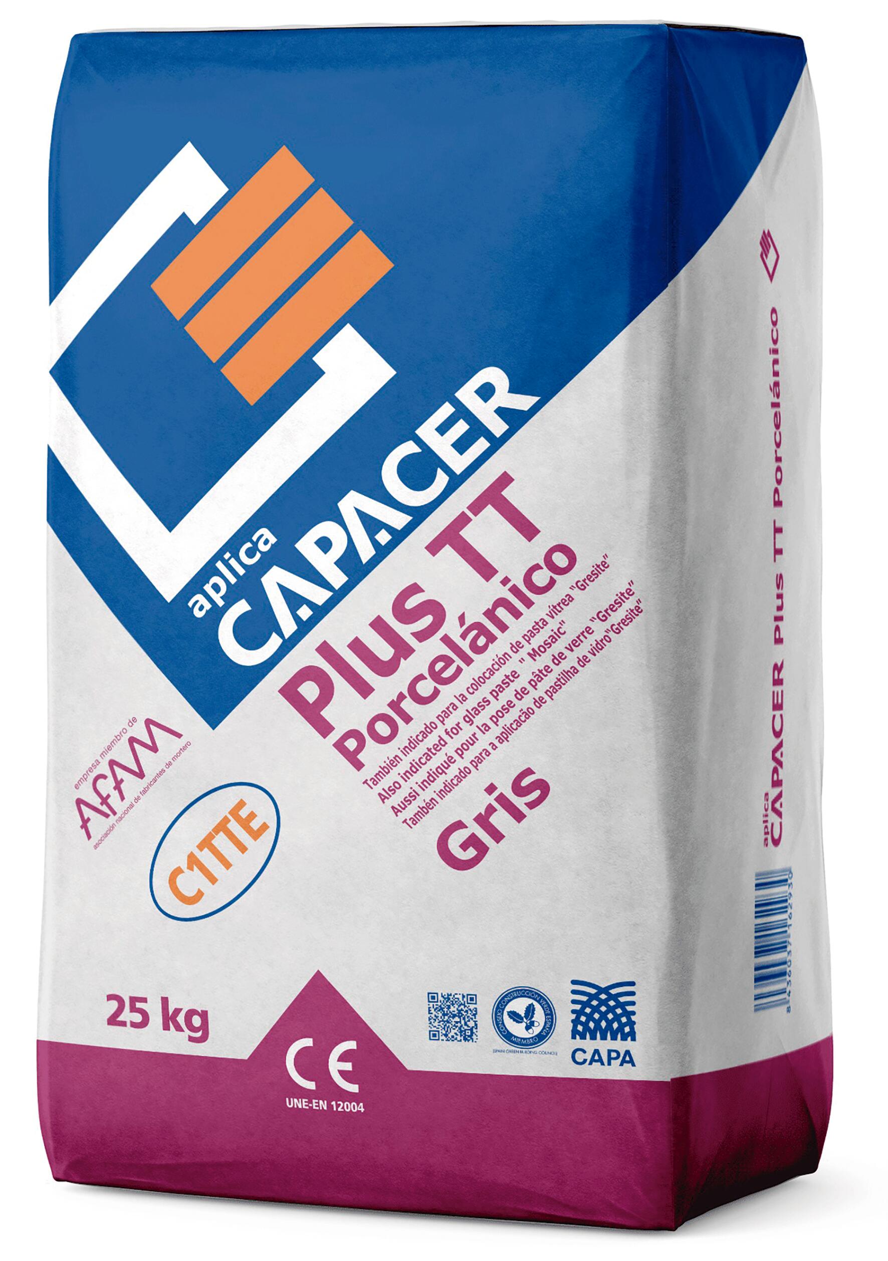 Cemento cola Capacer Plus TT es un adhesivo de alta resistencia a la humedad, colocación de piezas cerámicas de porosidad media-alta-bajan el interior y en el exterior. Elevada adherencia. Sacos 25 kg. Color gris.