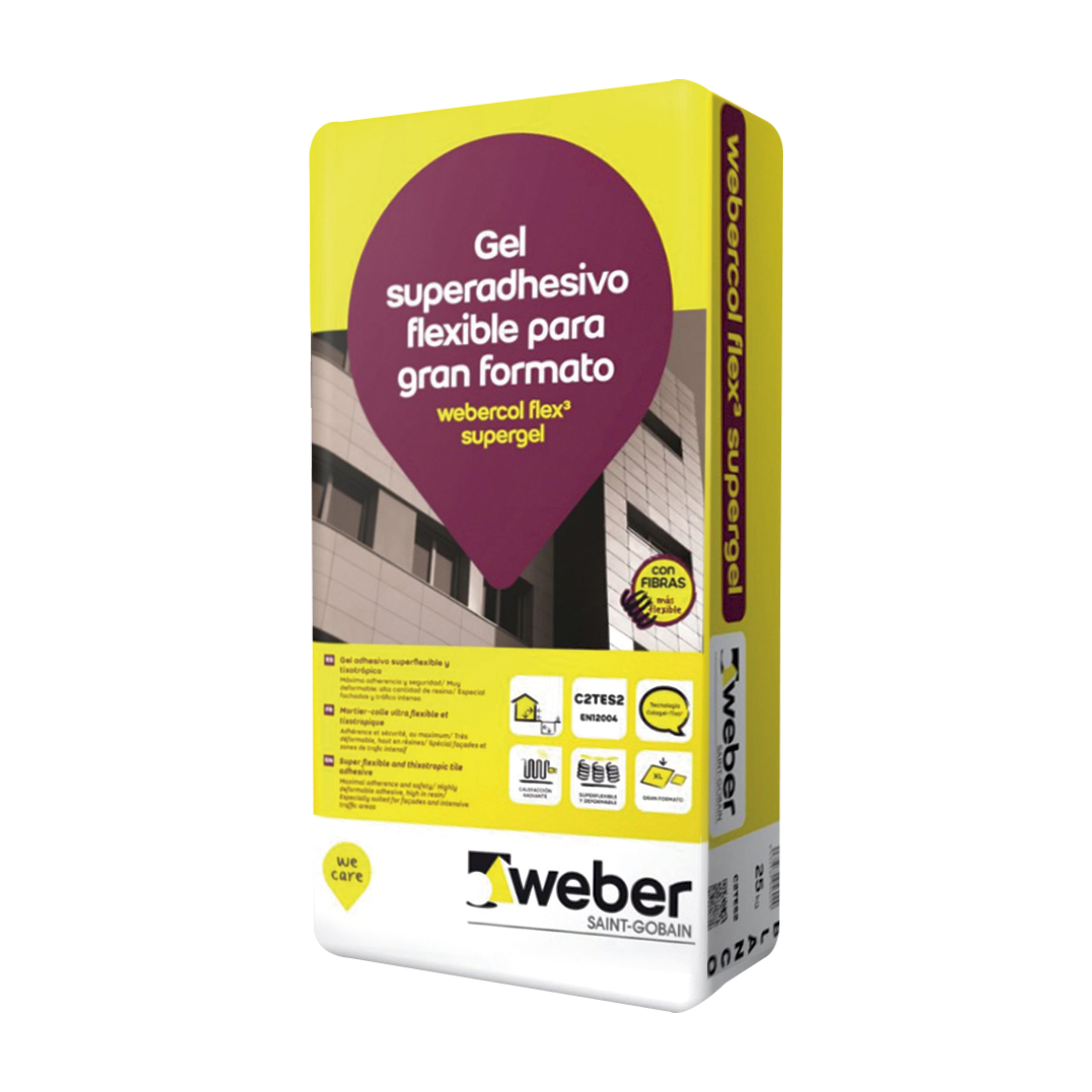 Cemento cola Webercol Flex 3 Supergel es un adhesivo apto para la colocación de todo tipo de baldosas cerámicas. Sacos de 25 kg. Color blanco. Uso tanto interior como exterior.