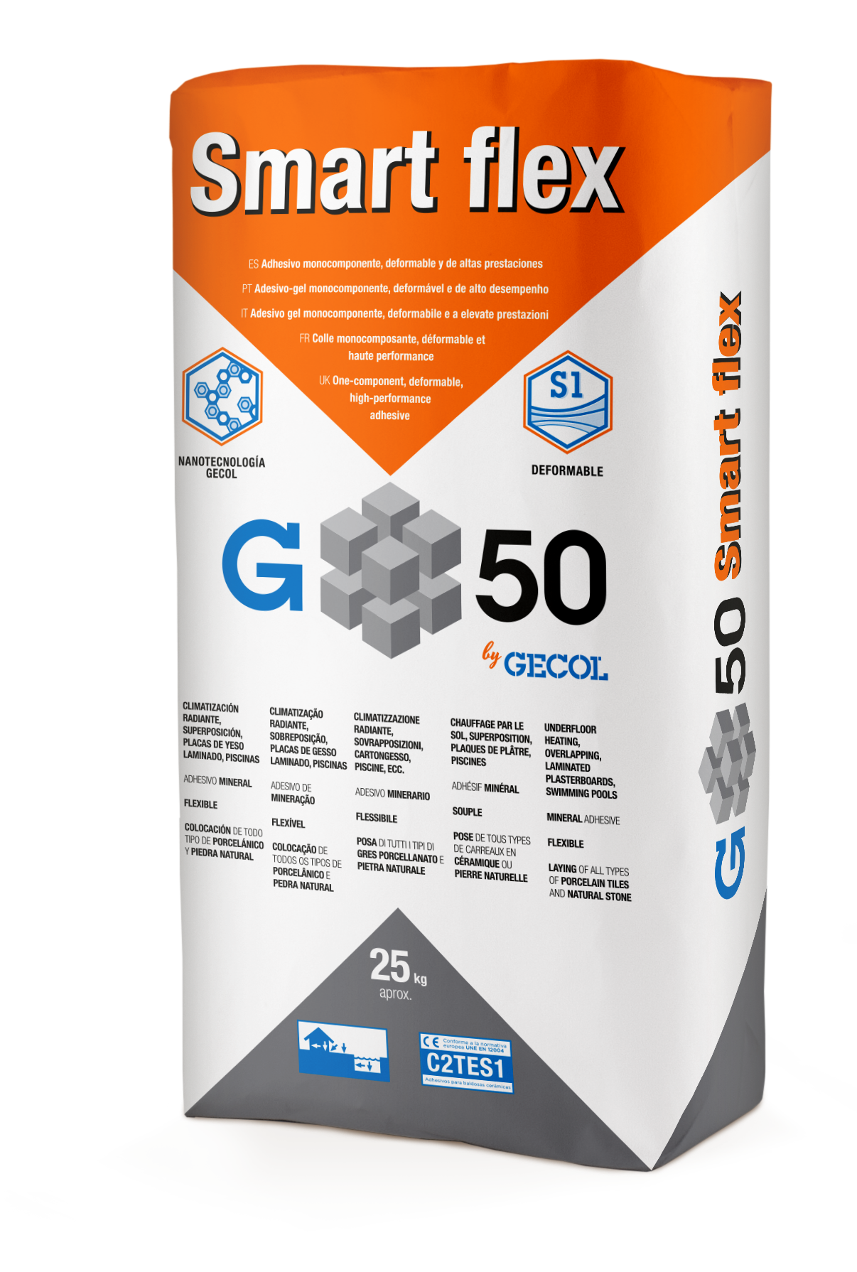 Cemento cola G50 Smart Flex es un adhesivo cementoso flexible, apto para la colocación de todo tipo de baldosas cerámicas y piedra naturales y/o reconstituidas. Sacos de 25 kg. Color blanco
