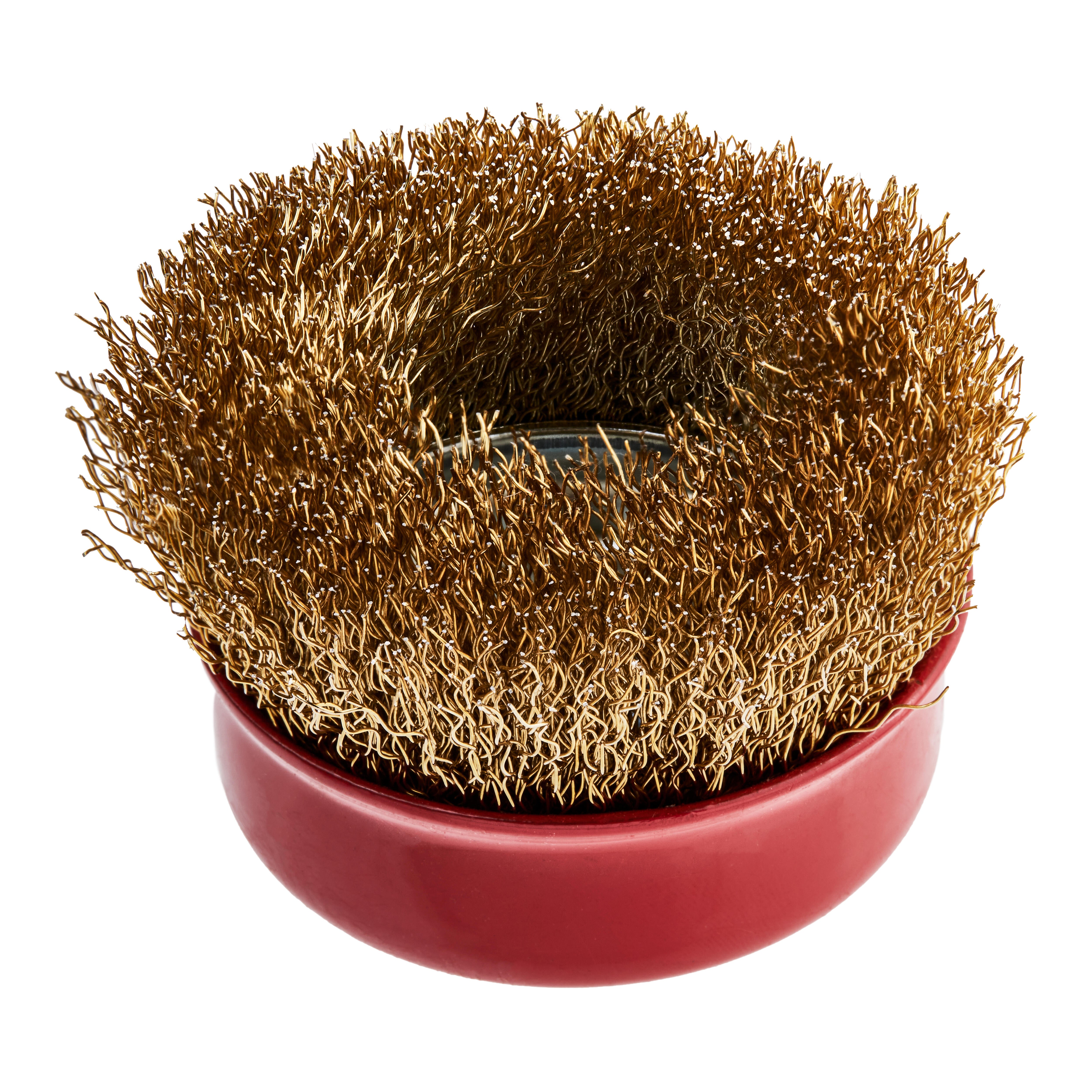 Cepillo taza acero latonado de alambre ondulado 0.3mm. Dimensiones: 75 mm x 30 mm. Cepillo para trabajar en superficies metálicas con amoladoras angulares (hasta 12.500 r.p.m) o mini amoladoras en caso de difícil acceso.