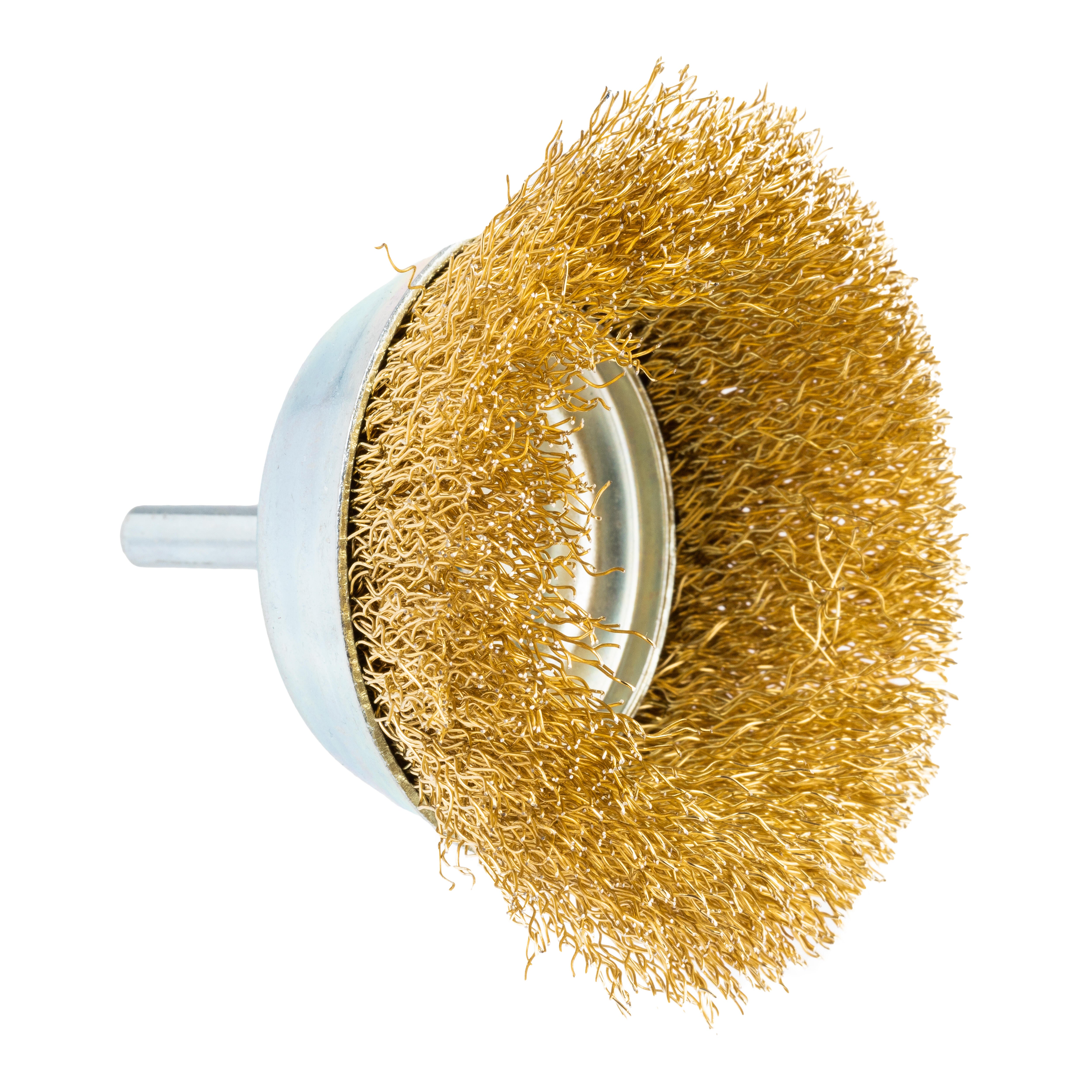 Cepillo copa de acero latonado con alambre ondulado. Medidas 60 x 60 x 75 mm. Para limpiar y eliminar pinturas, barnices, óxidos, pequeñas rebabas. Indicado para uso en taladros normales de un máximo de 4.500 r.p.m.