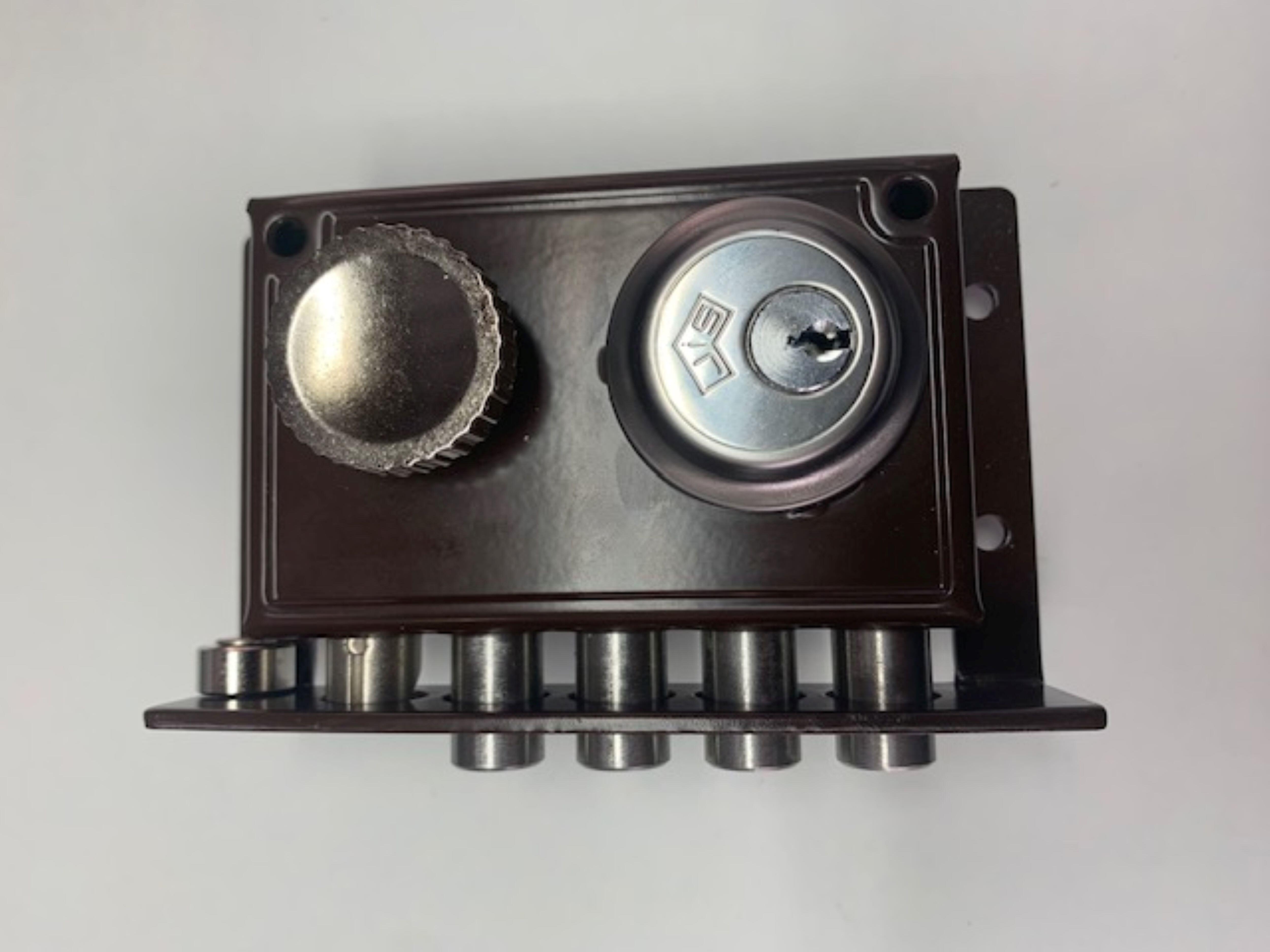 | Cerradura de sobreponer con cilindro regulable o graduable. Picaporte accionado con pomo y cuatro pestillos de acero inoxidable con dos vueltas. No reversible. Mano izquierda 3 llaves de alpaca. Cilindro regulable para puertas de 35 a 80mm. Anti palanca. Corrector de ajuste de nivel de la puerta. Vertical alto 140mm, ancho 88mm. Acabado pintado marrón |