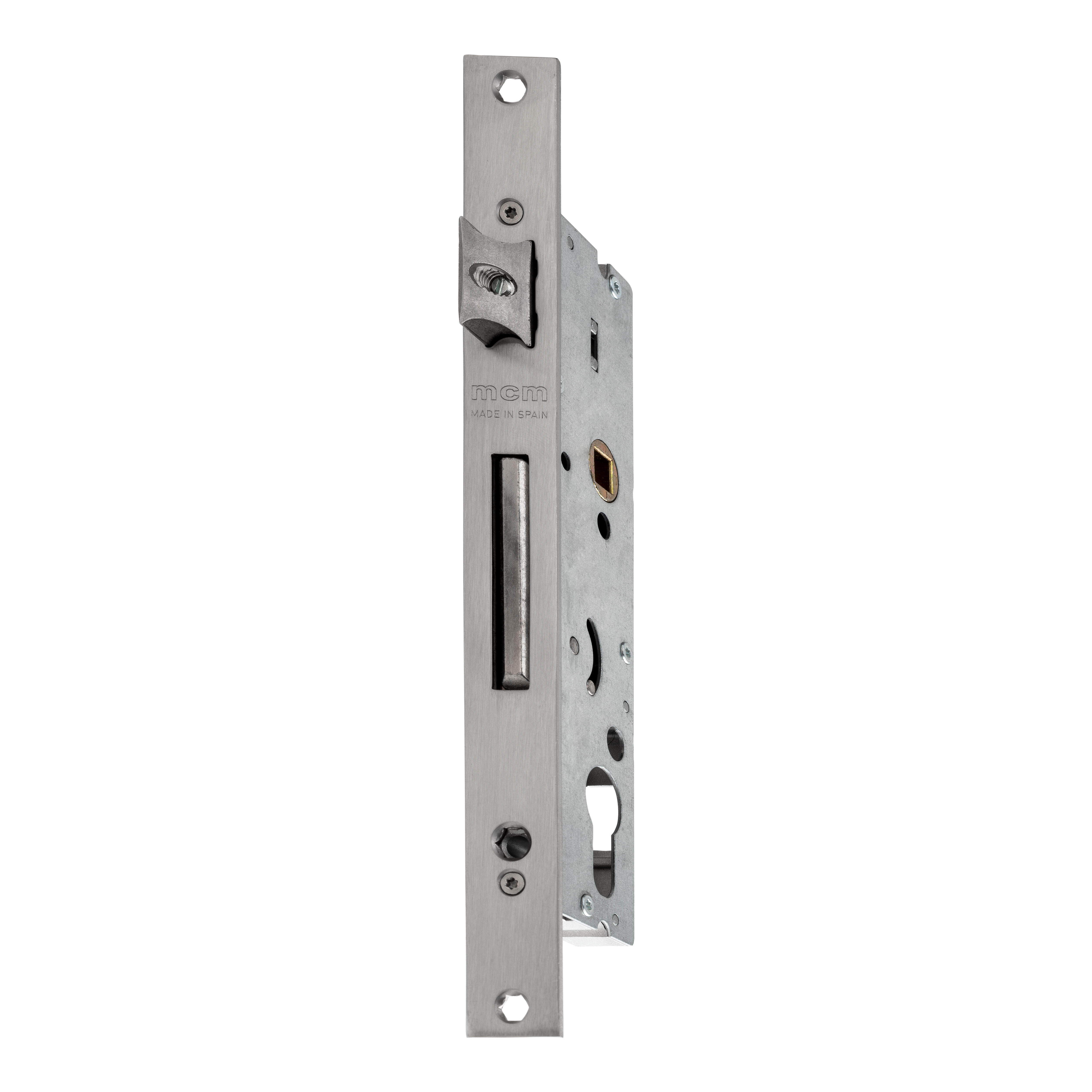 Entrada 30 mm. Palanca basculante. Picaporte reversible y regulable. Distancia entre ejes: 85 mm. Acabado acero inoxidable. Sin cilindro. Ancho de caja 15 mm