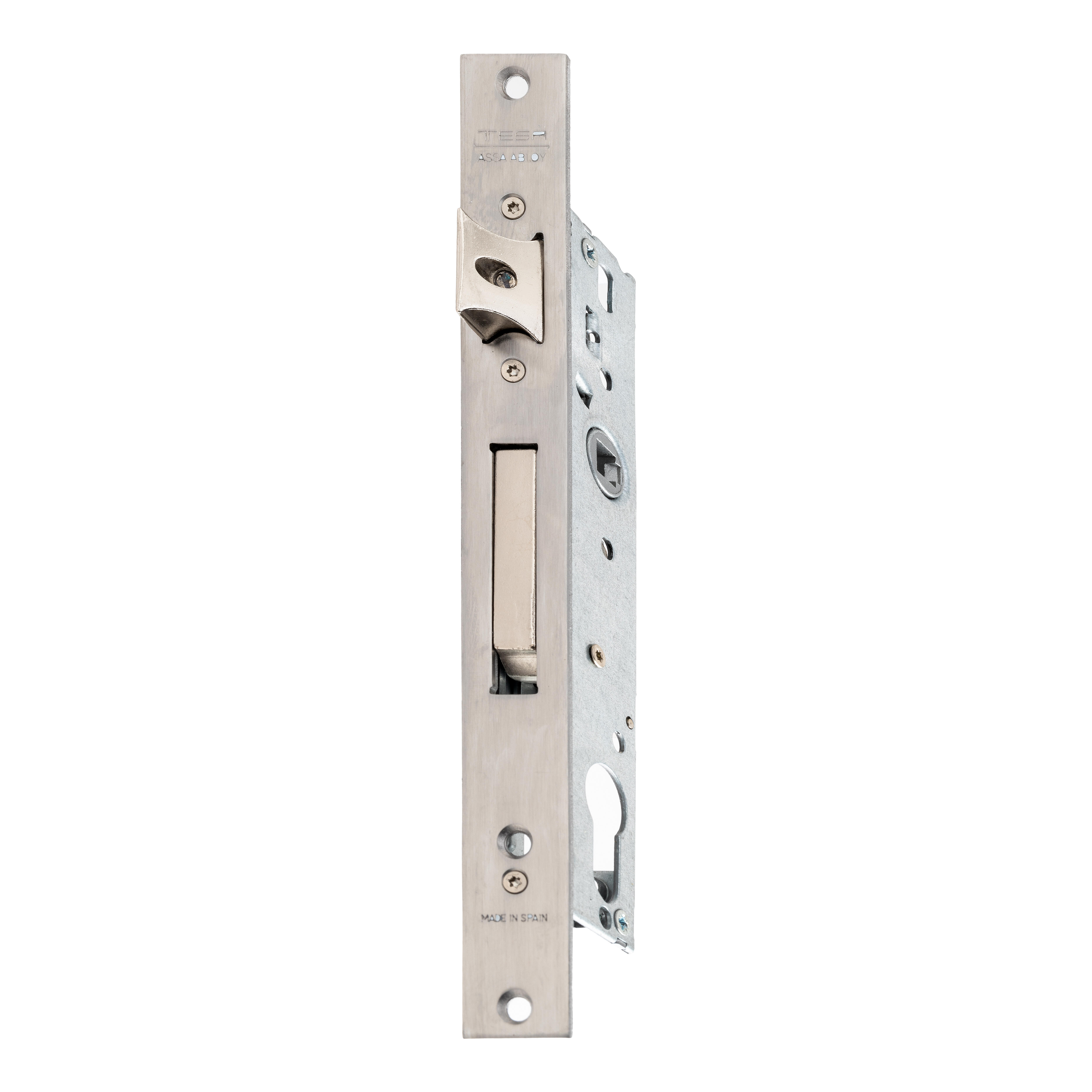 Cerradura para carpintería metálica sin cilindro Entrada 20 mm. Palanca deslizante reforzada. Salida palanca 12 mm. Picaporte reversible, accionable por manilla y llave. Frente y cerradero inox. Picaporte y palanca niquelados.