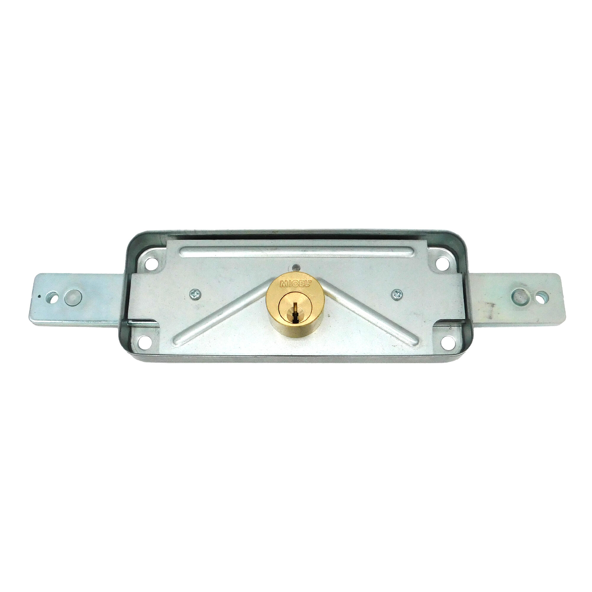 Cerradura metálica de cierre de persiana CRP01. Ideal para reforzar la seguridad de las persianas metálicas enrollables de locales comerciales, almacenes o garajes, con palancas laterales de acero. Apertura y cierre mediante llave con recorrido de 24mm (1 vuelta de llave). Se incluyen 3 llaves serreta para cilindro redondo con 3 pines que incluye. Realizada en acero. Acabado zincado para adaptar a cualquier color de puerta.