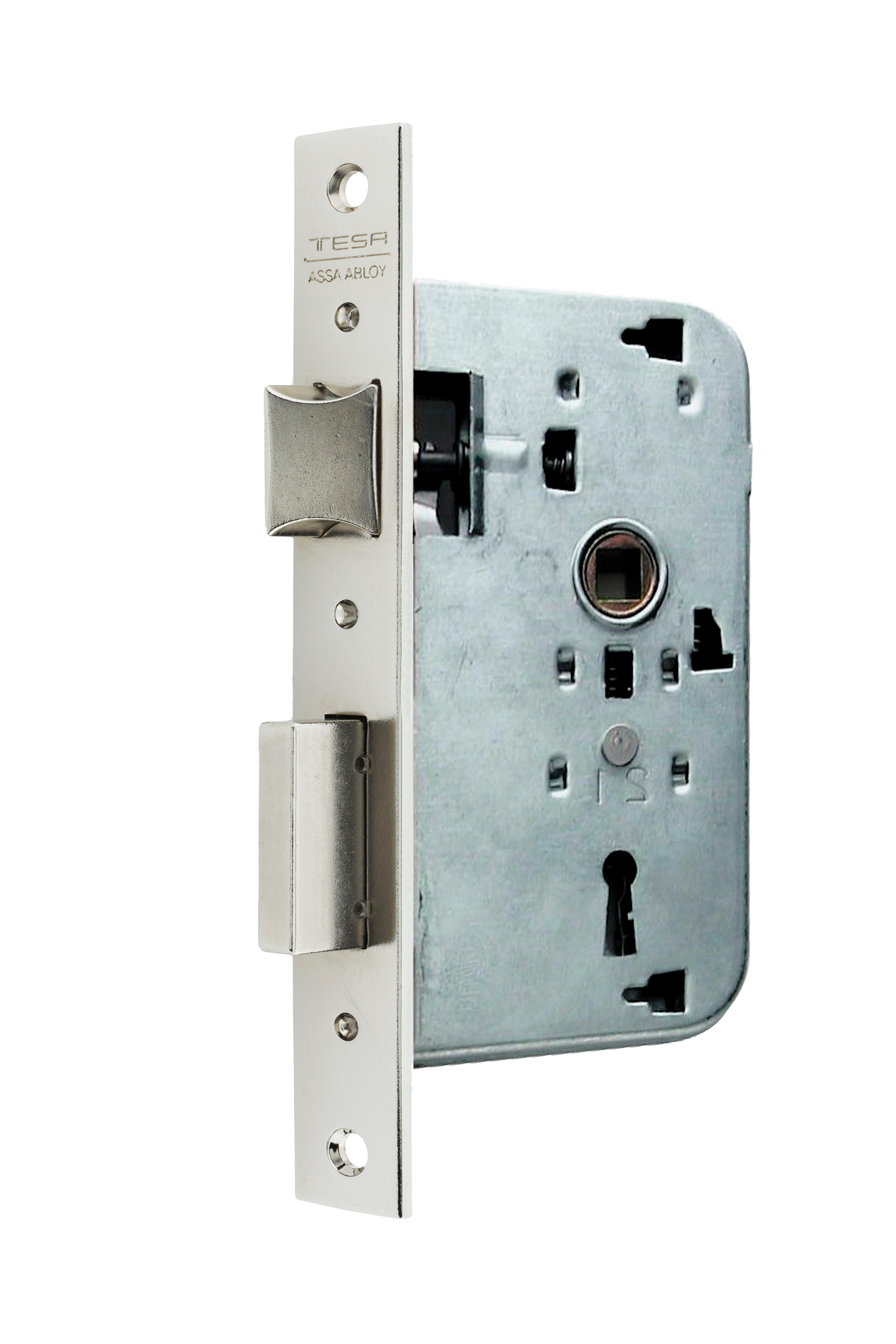 Cerradura de embutir para puerta de madera de 40 mm de entrada. Realizada en hierro y acabado en níquel. Reversible. Distancia entre ejes: 47,5m. Nueca de 8mm. Nueca de condena de 6mm. Frente estrecho adecuado para puertas con solapa 20 mm. Cilindro redondo TE-5 con dos llaves de gorja de acero niquelado